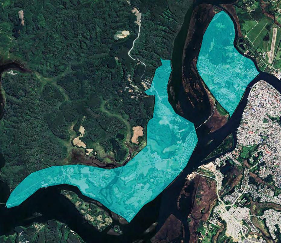 Vista aérea de los sitios disponibles en Valdivia versus el catastro de Humedales Urbanos. Fuente: Elaboración propia basada en información de geoportal Ministerio del Medio Ambiente