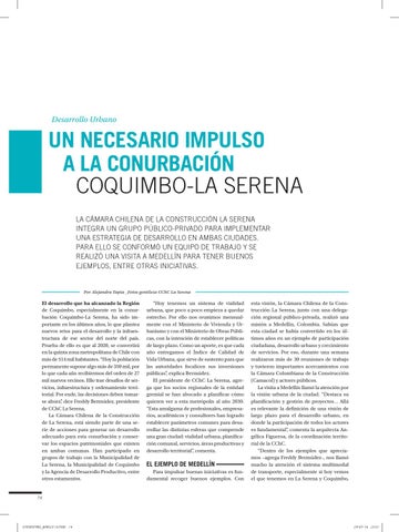 UN NECESARIO IMPULSO A LA CONURBACIÓN COQUIMBO-LA SERENA LA CÁMARA CHILENA DE LA CONSTRUCCIÓN LA SERENA INTEGRA UN GRUPO PÚBLICO-PRIVADO PARA IMPLEMENTAR UNA ESTRATEGIA DE DESARROLLO EN AMBAS CIUDADES. PARA ELLO SE CONFORMÓ UN EQUIPO DE TRABAJO Y SE REALIZÓ UNA VISITA A MEDELLÍN PARA TENER BUENOS EJEMPLOS, ENTRE OTRAS INICIATIVAS.