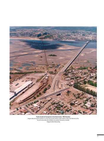 Puente Llacolén de Concepción en fase final de obras, 1999, Diciembre. Imagen aérea del puente Llacolén en su fase final de obras desde la ribera donde se ubica San Pedro de La Paz. Se ven las dos orillas del río Biobío y los puentes Ferroviario y Llacolén. Fotógrafo Didier Rousset Buy.