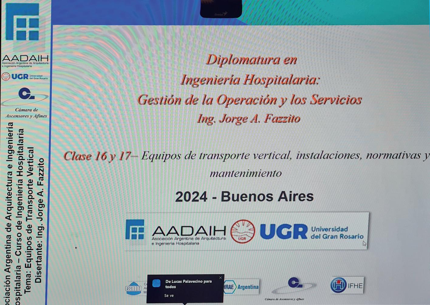 Otro artículo se ocupa de la disertación del ingeniero Jorge Fazzito sobre transporte vertical, organizada por la Asociación Argentina de Arquitectura e Ingeniería Hospitalaria de la Universidad del Gran Rosario y que contó con numerosos participantes, muchos de Latinoamérica.