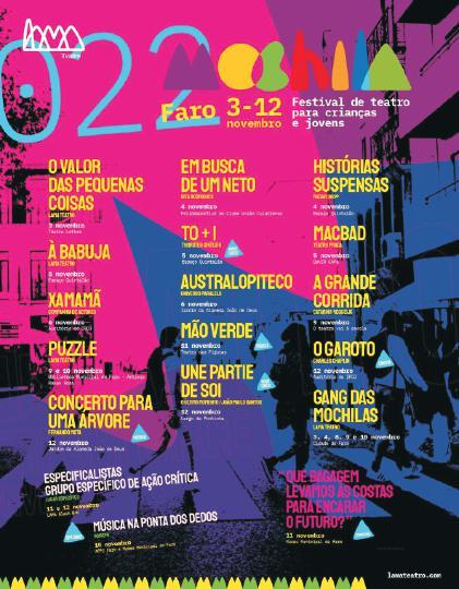 Destinatários: famílias Org. CMF/BMF Local: Biblioteca Municipal de Faro António Ramos Rosa informações: info@lamateatro.com 19H30 e 21H009 e 10 NOV MOCHILA um conjunto de histórias reais, contadas na primeira pessoa, "roubadas" em cada beco, que se misturam ao sabor do vento e que ecoam pela cidade. Festival de teatro para crianças e jovens ENTRADA LIVRE ESPETÁCULO