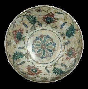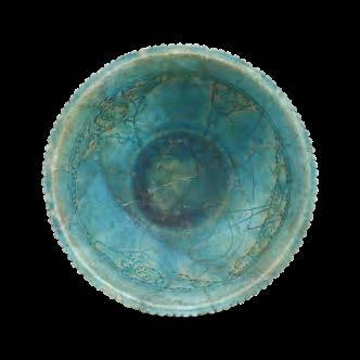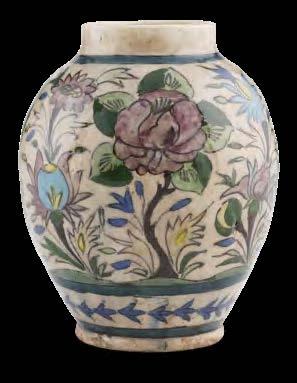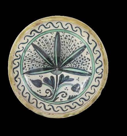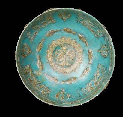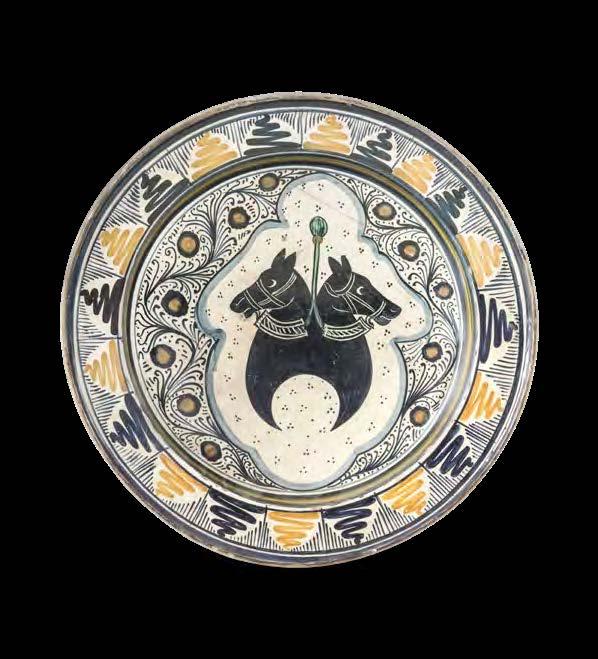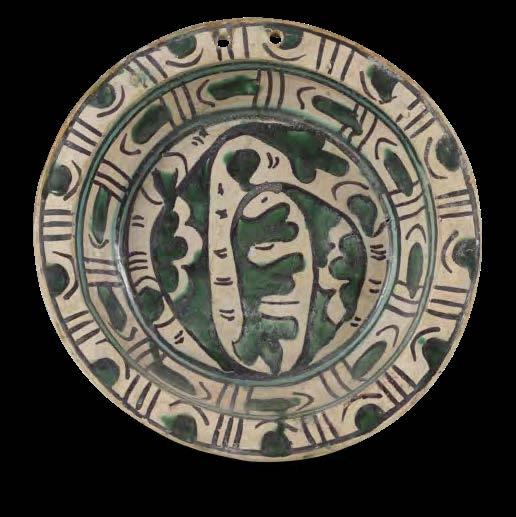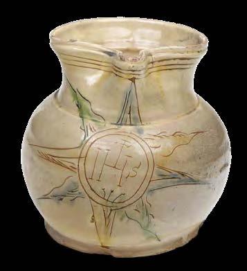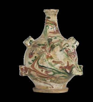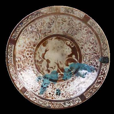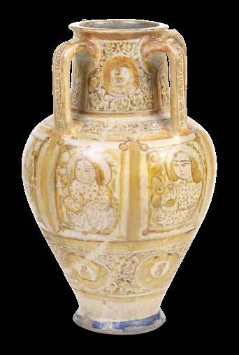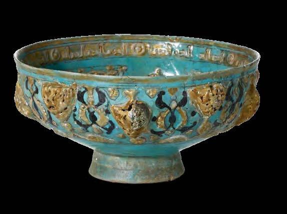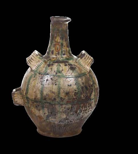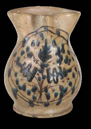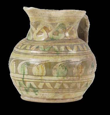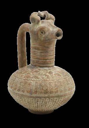 Interessante ed elegante versatoio, probabilmente realizzato sotto la dinastia selgiuchide. Ha una forma globulare e poggia su un basso piede ad anello. Il collo cilindrico è scandito da sottili modanature orizzontali e termina con un beccuccio sagomato a forma zoomorfa. L’ansa, piena e arcuata, collega la spalla all’orlo superiore. La super cie è interamente decorata in rilievo con motivi geometrici e tomor stilizzati, disposti in registri orizzontali: una fascia superiore con elementi tomor , una fascia mediana con un fregio epigra co e una fascia inferiore con un motivo puntinato che enfatizza il volume globulare del corpo. Residui di ingobbio chiaro evidenziano il contrasto con l’impasto rosato della terracotta
