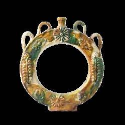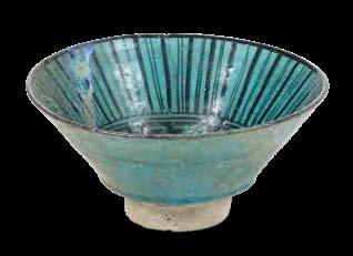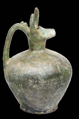 La brocca, dal corpo globulare e con l’estremità superiore modellata a forma di testa di toro, è stata realizzata a stampo e ricoperta di invetriatura verde. Le teste taurine sono frequenti in questo periodo, soprattutto negli oggetti metallici, e si ipotizza che abbiano un simbolismo astrologico (Toby Falk, Treasure of Islam, catalogo della mostra, New Jersey, 1985, p. 233)