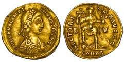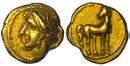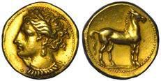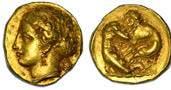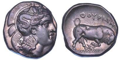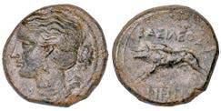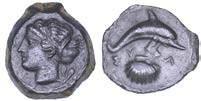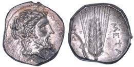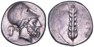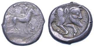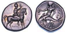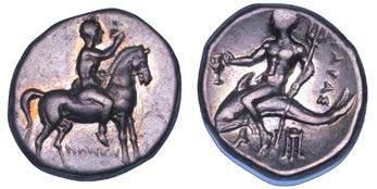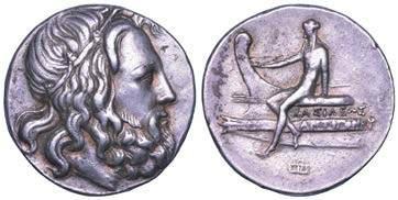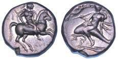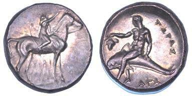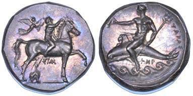 Efebo nudo a cavallo incorona l’animale a s. R/ Taras cavalca delfno verso s. e tiene in mano un grappolo d’uva. Vlasto 673. HN Italia-960. g. 7,91. Diam. mm. 21,51. Arg. SPL Conservazione eccezionale.