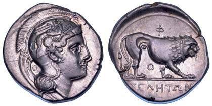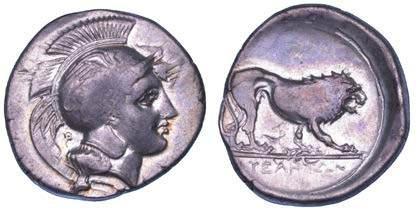 Cavaliere incorona il proprio cavallo in movimento verso d.; in alto, Nike in volo incorona il cavaliere. R/ Taras cavalca delfno verso s. e regge corona e tridente; a d., TAΡAΣ; sotto il delfno, HP. Vlasto 506. Jameson 140. SNG Ashmolean 275. Fischer-Bossert 789. Historia Numorum Italy 886. g. 7,90. Diam. mm. 21,43. Arg. Brillante patina iridescente di monetiere. Migliore di SPL Conservazione eccezionale.