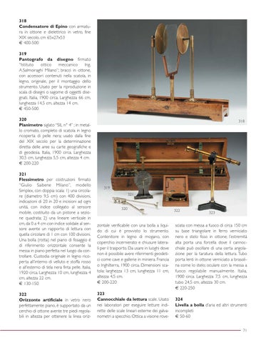 318 Condensatore di Epino con armatura in ottone e dielettrico in vetro, fine XIX secolo, cm 65x27x53 € 400-500 319 Pantografo da disegno firmato “Istituto ottico meccanico Ing. A.Salmoiraghi Milano”; bracci in ottone, con accessori contenuti nella scatola, in legno, originale, per il montaggio dello strumento. Usato per la riproduzione in scala di disegni o sagome di oggetti disegnati. Italia, 1900 circa. Larghezza 66 cm, lunghezza 14,5 cm, altezza 14 cm. € 450-500 320 Planimetro siglato “SIL n° 4” ; in metallo cromato, completo di scatola in legno ricoperta di pelle nera; usato dalla fine del XIX secolo per la determinazione diretta delle aree su carte geografiche e di geodesia. Italia, 1900 circa. Larghezza 30,5 cm, lunghezza 5,5 cm, altezza 4 cm. € 200-220