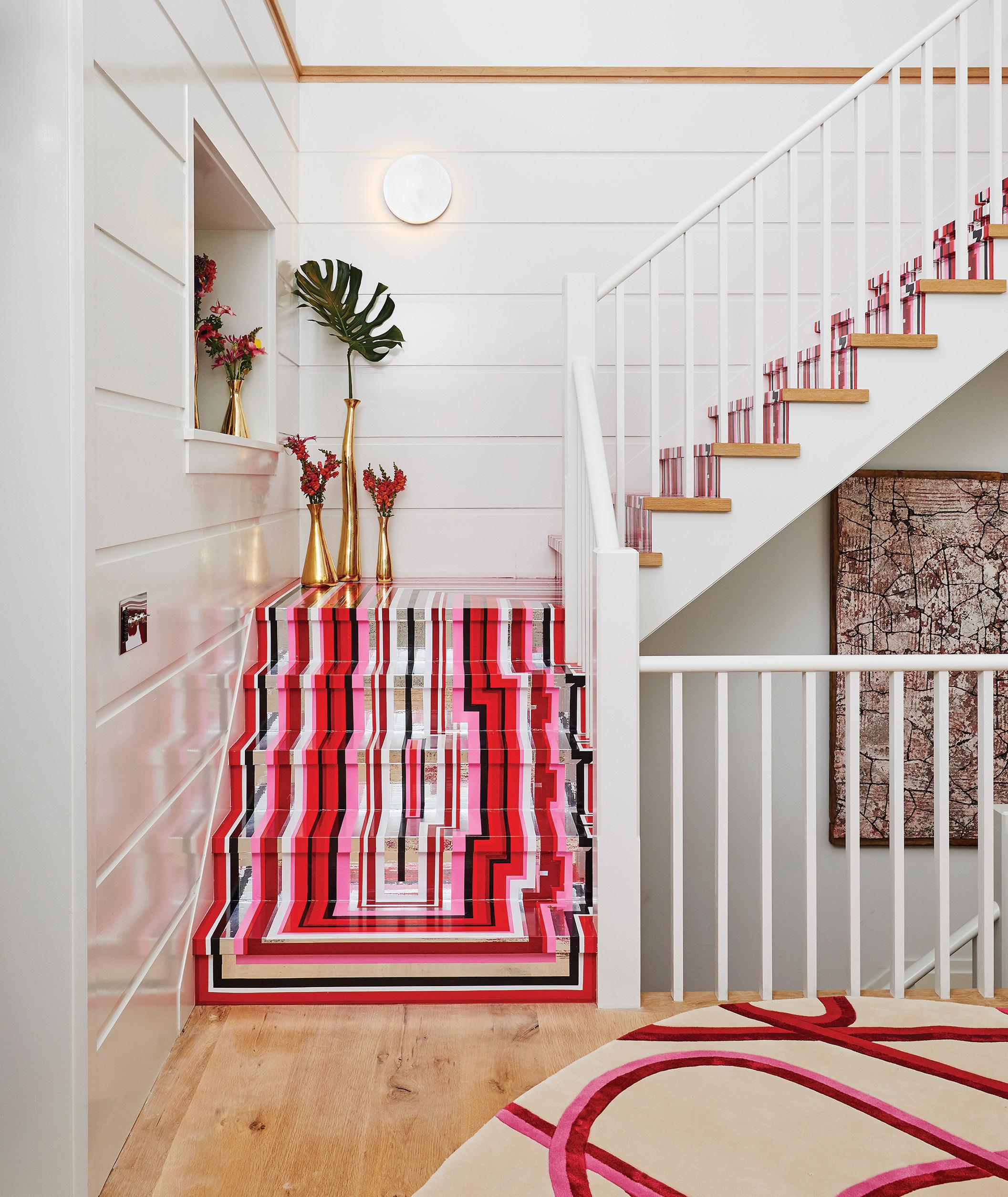 1 / ALWAYS EXPLORING AVANT-GARDE DESIGN , Cambria Style featured this show house grand foyer with its unforgettable staircase art installation by Jim Lambie—a waterfall of red, pink, black, silver, and white—that makes a major statement in this entryway, not to mention the beautiful kitchen covered in Portrush™.