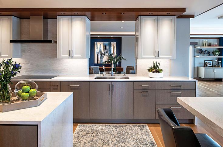 2 / NESTLED ON THE NORTH SHORE is a home designed by architect Christopher Strom featuring Brittanicca™ in the kitchen. The family room’s stone fireplace and large windows serve as an invitation to cozy up and enjoy the view.