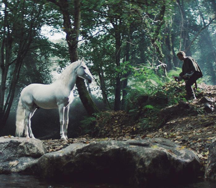 AS THE MEN ROAM BRITTANICCA , they spot a white horse in the trees near a lake. When Albanactus and Locrinus try to capture the animal, rock giants emerge from the earth. Camber’s pure heart enables him to vanquish the brutish beasts and rescue the horse, which is revealed to be a kelpie. Wandering through the forest, Camber comes upon a waterfall where he spots a lovely water nymph who he discovers is Aeres, Lady of the Falls.