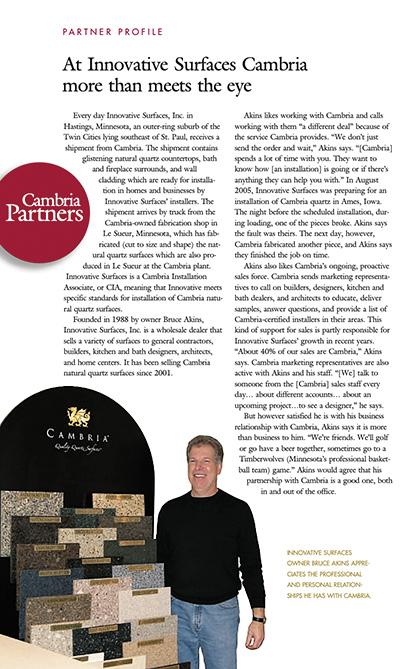 It was a seminal moment in Cambria’s history, as many other operations like Akins’s soon followed his lead, and Cambria more quickly expanded its reach nationally. “It was a bold, bold move by Bruce and his team. They believed in us, trusted us, they took a big chance on us, and we developed a tremendous partnership, working very closely together to expand our businesses.”