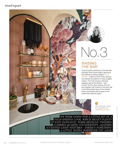 To give a petite poolside bar of the Kips Bay Decorator Show House Dallas a glamorous look befitting its setting, designer TRACI CONNELL pulled out all the stops, layering luxe textures and patterns on every available surface. “The richly textured, whimsical wallpaper gets all the attention,” says Connell, “but the other surfaces, from the faux-shagreen wall covering on the back wall to the fluted cabinet doors to the Cambria Colton countertops add the layers of rich interest that make the space.”