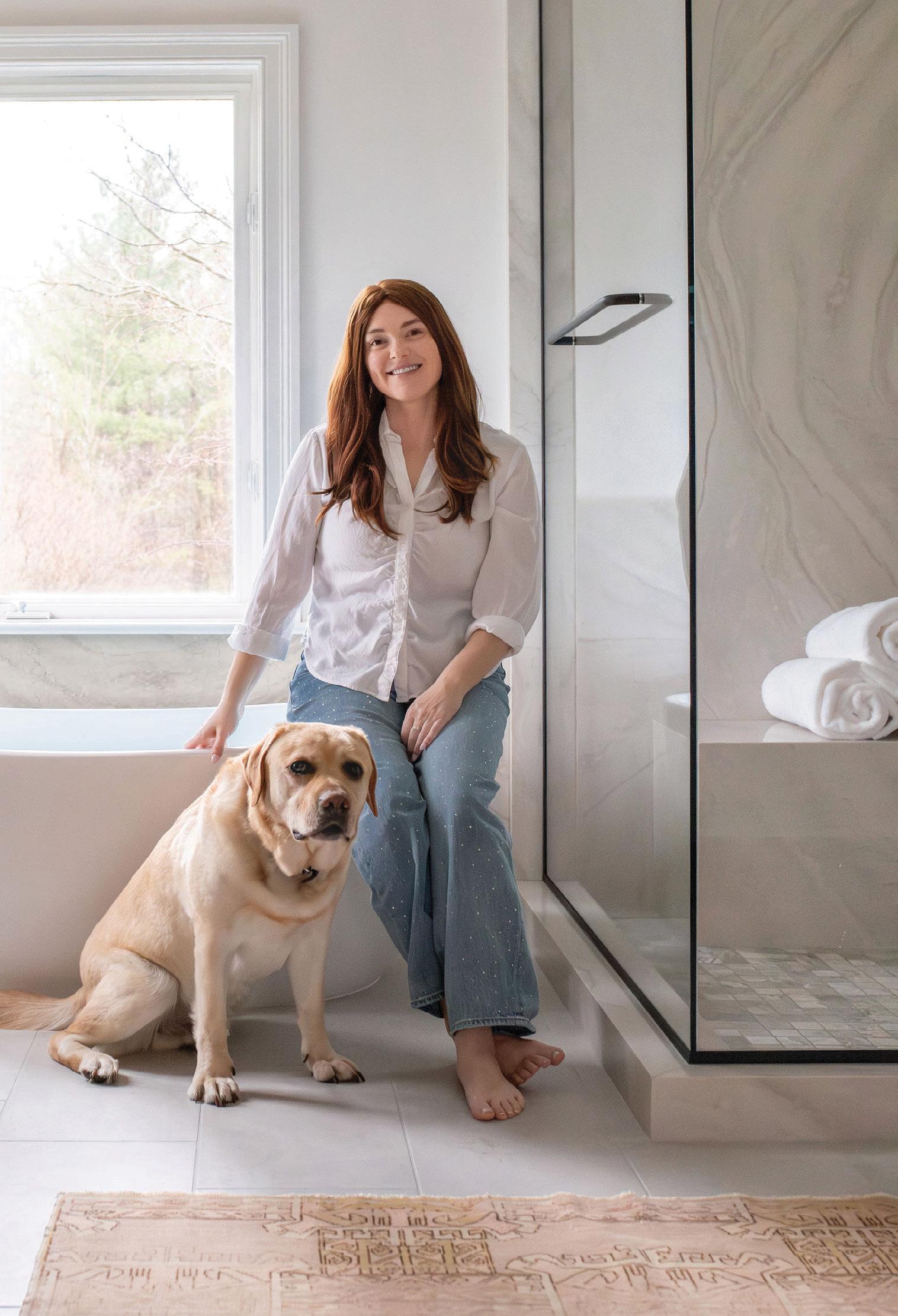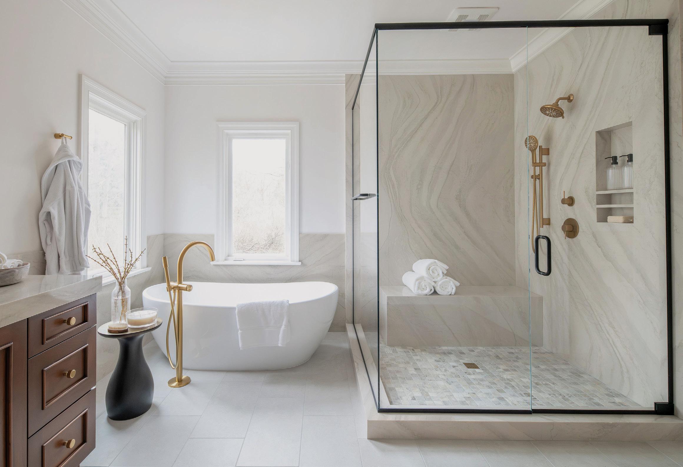 BATHROOM PG 18 & 19: Vanity countertop, wallcladding, shower walls, and bench in Everleigh Warm by Cambria, CambriaUSA.com. Wall and trim color in Marshmallow by Sherwin Williams, sherwin-williams.com. Veronica Bianco floor tile from The Tile Shop, tileshop.com. Atrio Collection plumbing fixtures in cool sunrise from Grohe, grohe.us. Wyndham Collection 65" Rebecca free standing soaking tub. Custom cherry vanity cabinets in black/brown glaze finish. Dempsey round knob cabinet hardware in honey bronze from Top Knobs, topknobs.com. Duncan rectangular mirrors in tobacco full-grain leather from Made Goods, madegoods.com. Esculpa 18" elongated wall light in alabaster and antique burnished brass from Visual Comfort, visualcomfort.com Claros silver tumbled travertine mosaic shower floor tile from The Tile Shop, tileshop.com.
