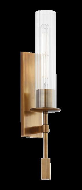 ACCESSORIES PG 29: Olina chandelier in antique brass/ebony, vintage coupe glasses in dusty purple and sea blue, mix appliance pull handle in aged brass, Riva outdoor coffee table, Harper chair in heirloom sienna, Clivedon sconce in aged brass with off white, Naomi collection no. 4 rug, and Loloi linen pillow in olive stripe from Stoffer Home, stofferhome.com