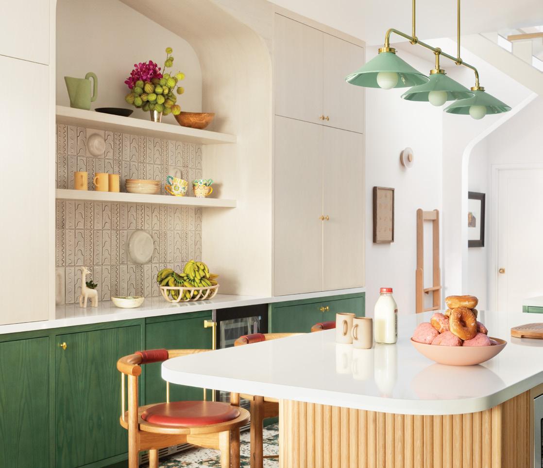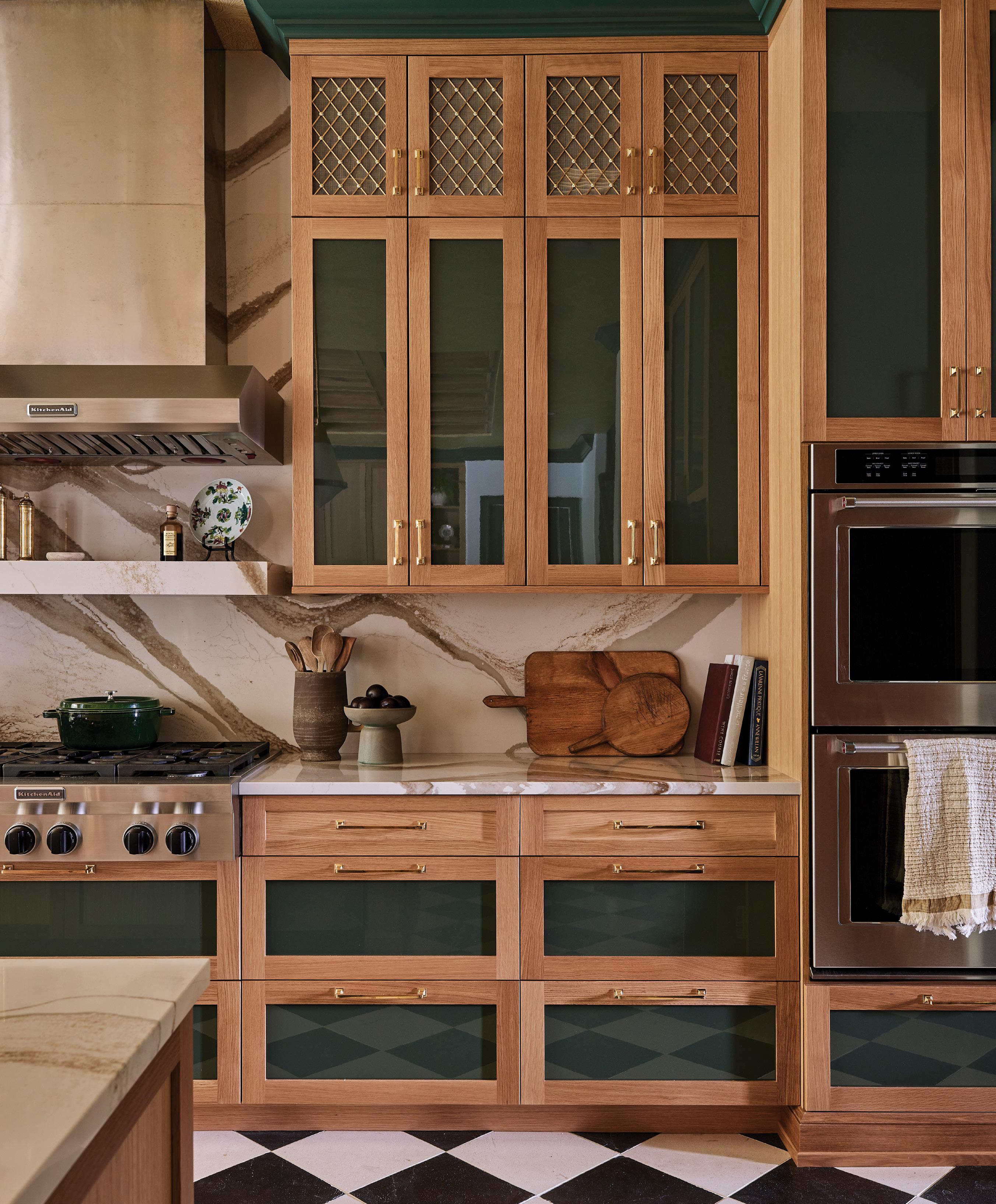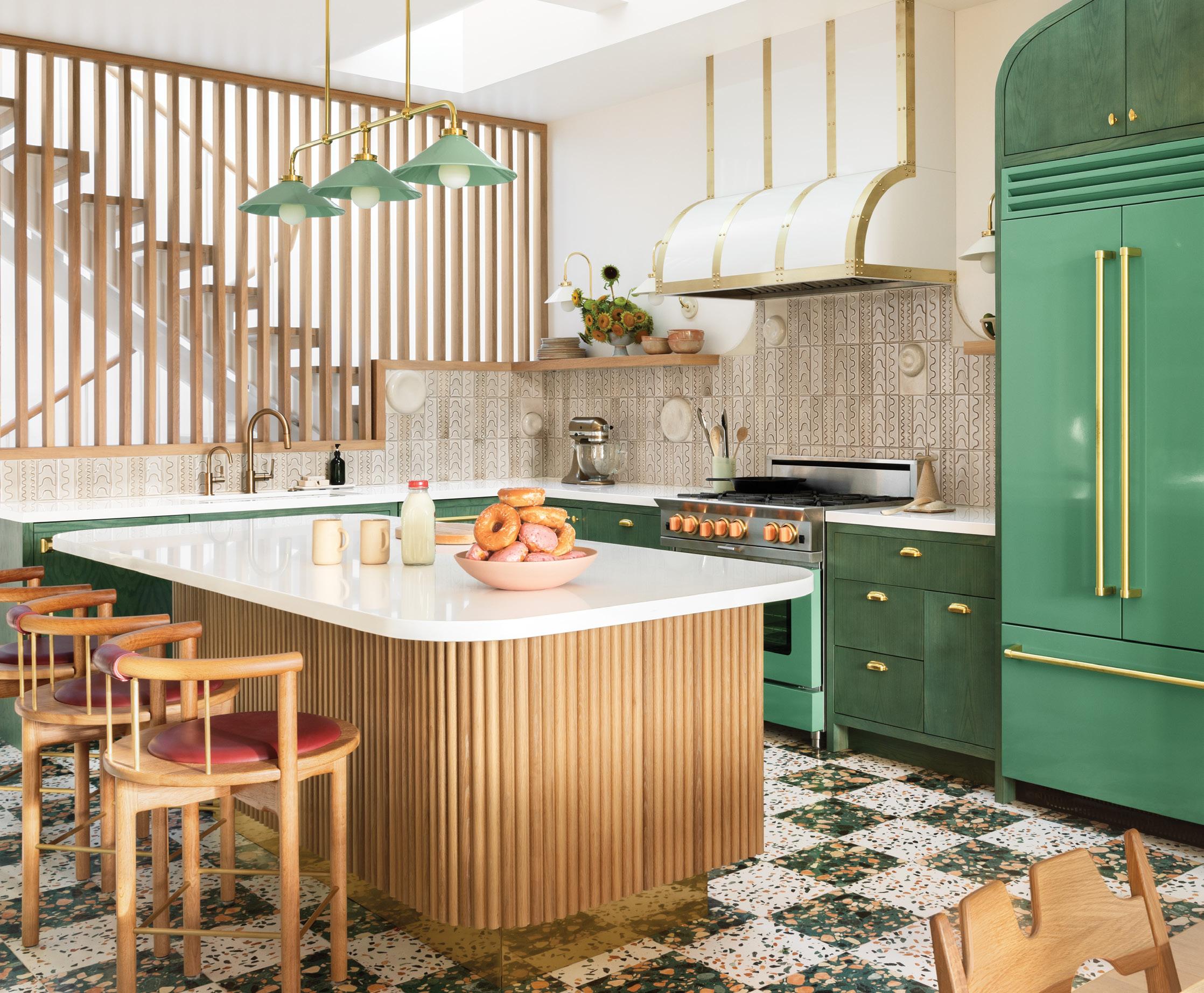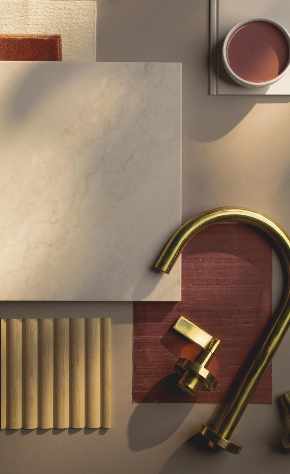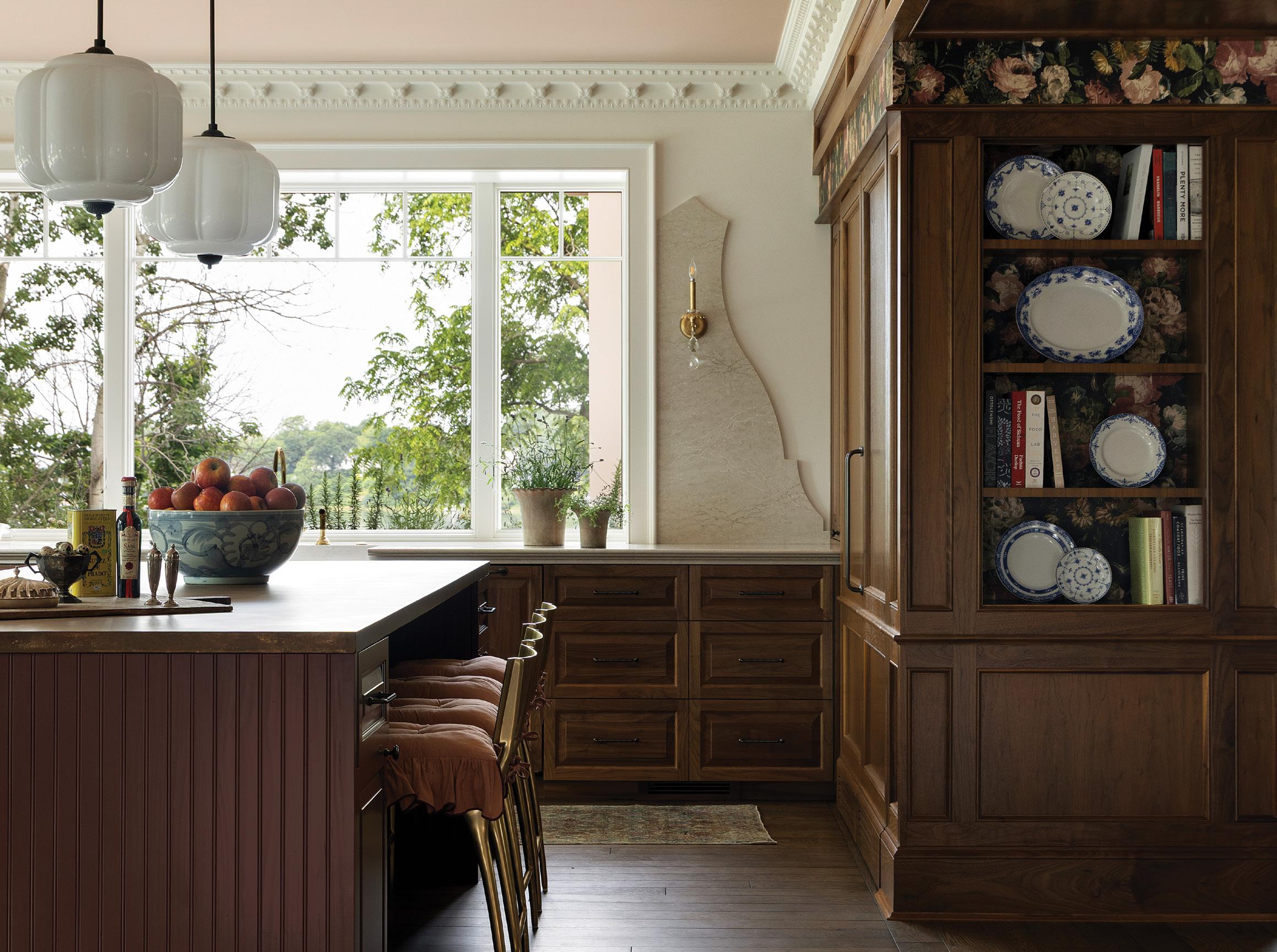 from Stoffer Home, stofferhome.com. Kitchen island and perimeter countertop and backsplash in Everleigh; moodboard quartz sample in Everleigh Warm, all by Cambria, CambriaUSA.com. Moodboard background paint color in Weimaraner; paint sample in Hodley Red, by Benjamin Moore, benjaminmoore.com. Gooseneck sink faucet from Kallista, kallista.com. Cabinet sample from Dura Supreme, durasupreme.com Tambour wood from Havwoods, havwoods.com Regal mohair textile in Rosewood from Schumacher, schumacher.com. Kravet Smart textile and wallpaper from Kravet, kravet.com.