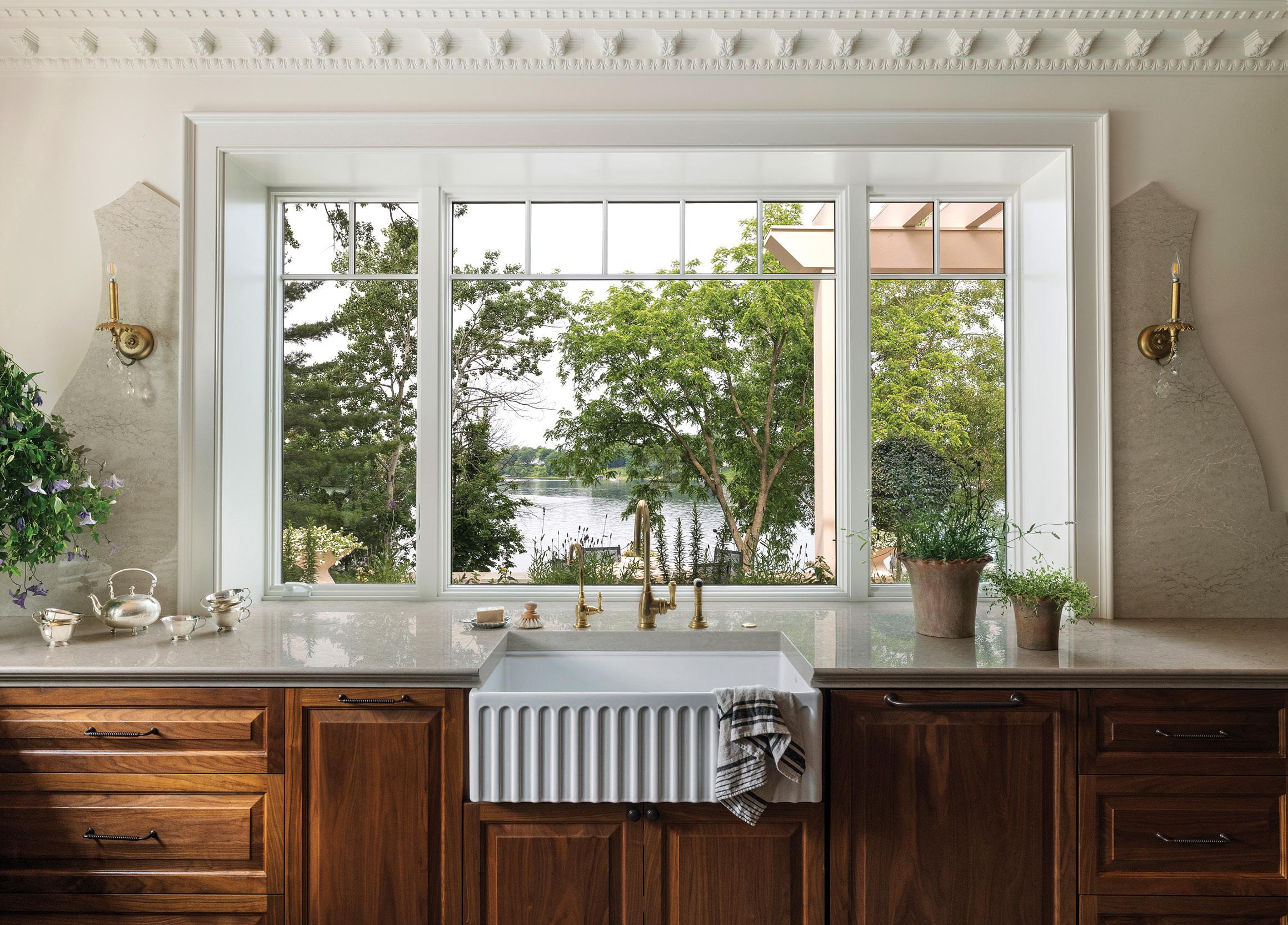 The quartz backsplash aligns perfectly with the bottom of the window with a sill also made of Cambria—the perfect space for herb or flower pots with no worry over water rings or staining.