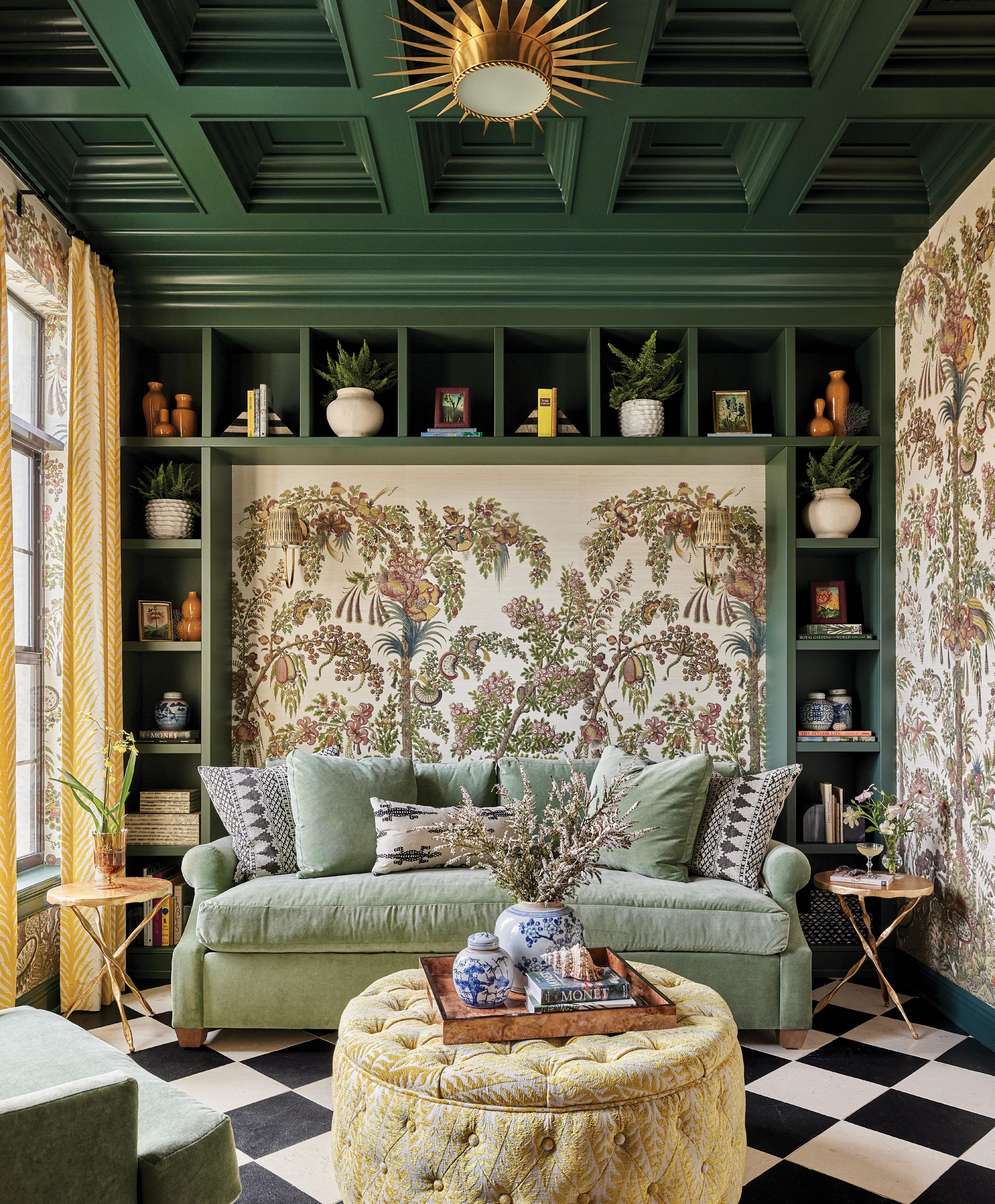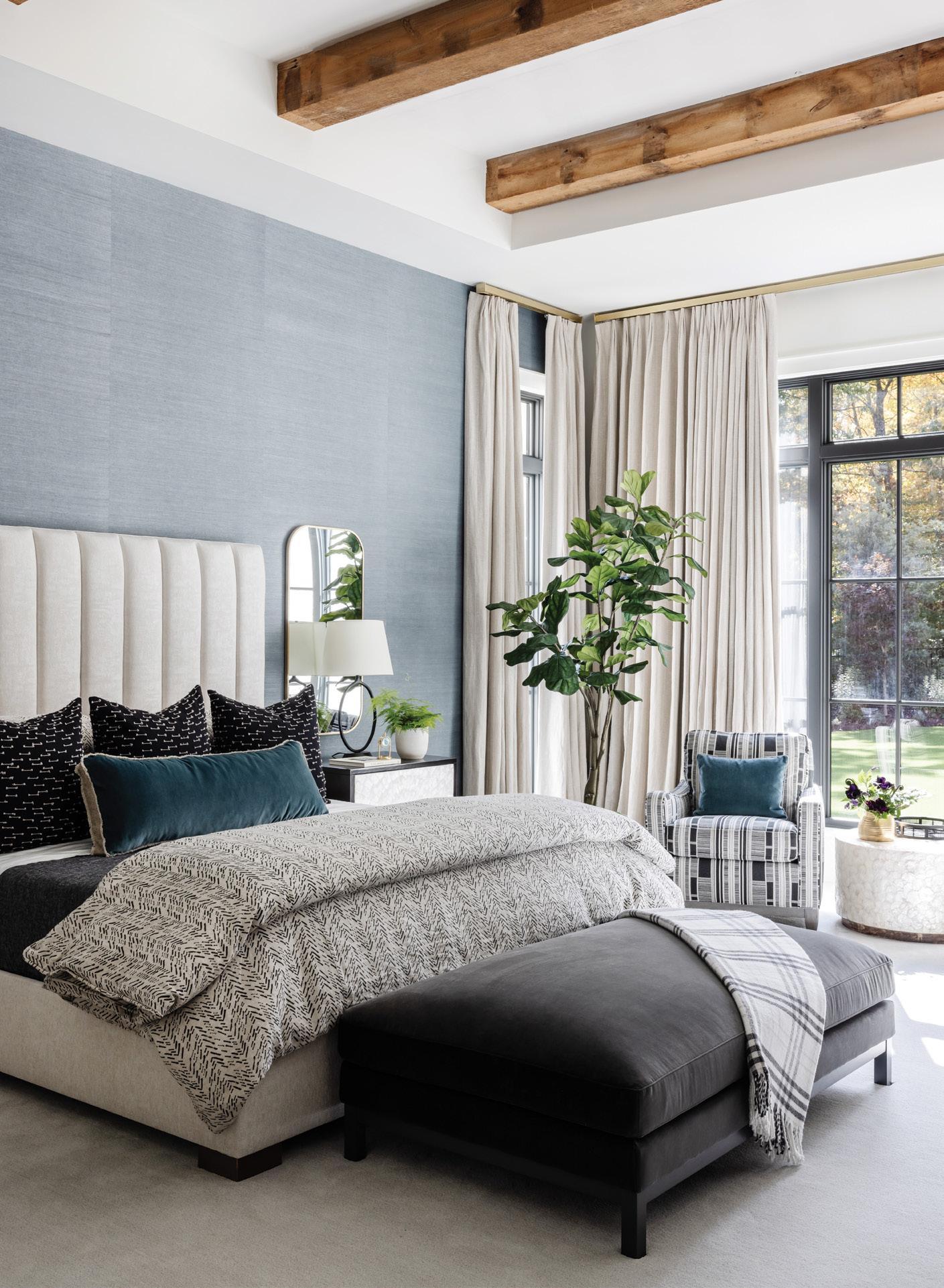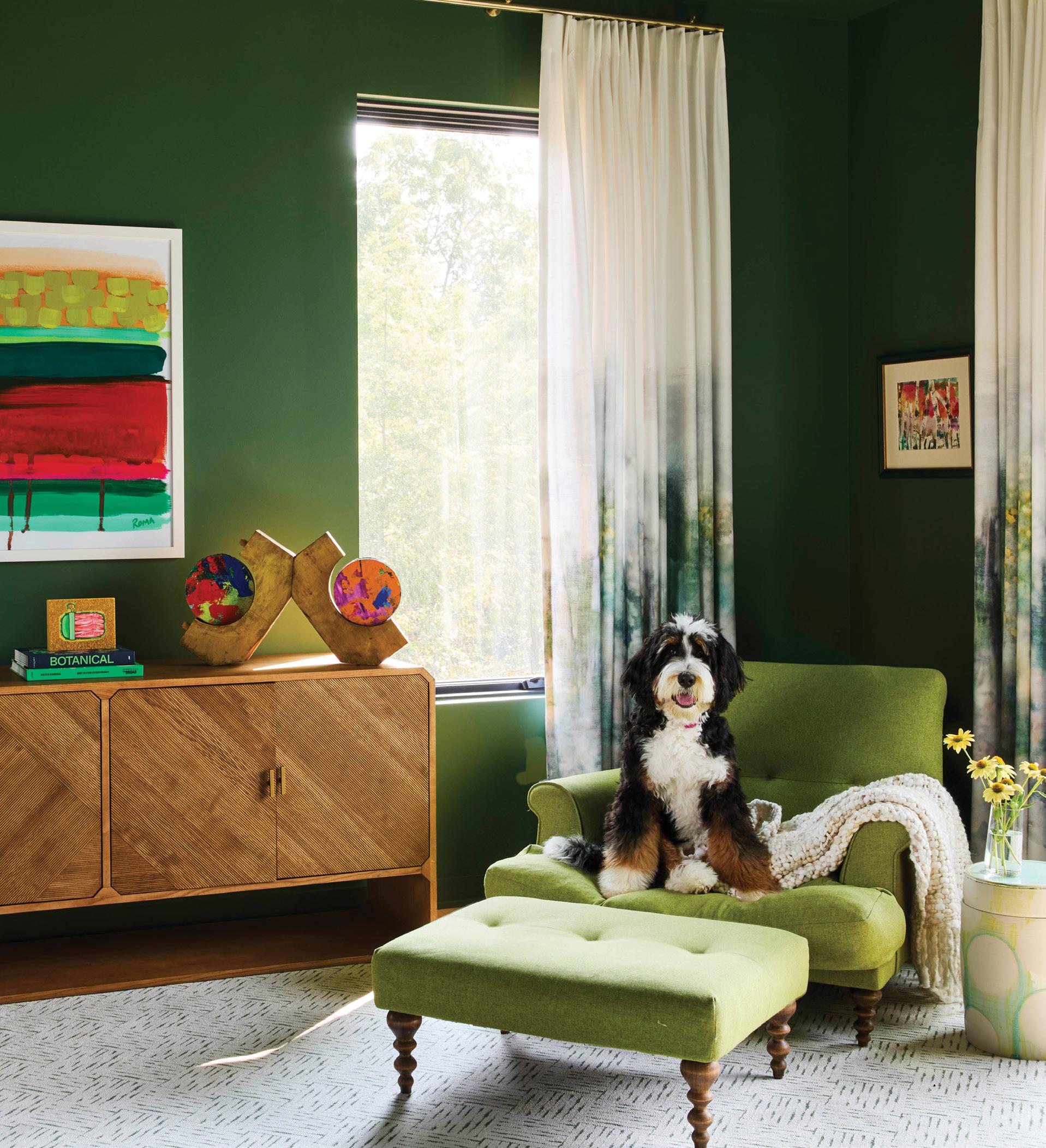 BEDROOM PG 31: Sisal natural grasscloth wallpaper in emerald. Custom bed from Parker Southern, parkersouthern.com Custom bedding and drapery fabricated by Sew Unordinary, sewunordinary.net. Adagio nightstands from Bernhardt, bernhardt.com Indo table lamp from Generation Lighting. Taft mirror from Uttermost, uttermost.com. Jasper ottoman from Interior Define, interiordefine.com Lillian August custom side chair from A. Hoke Ltd, ahokelimited.com. Round capiz coffee table by Jeffan. Fanimation spitfire ceiling fan. ACCESSORIES PG 31: Angler medium lantern, Elton wall sconce, indigo stitch pillow cover, Agnes ceramic vase in antique cream,