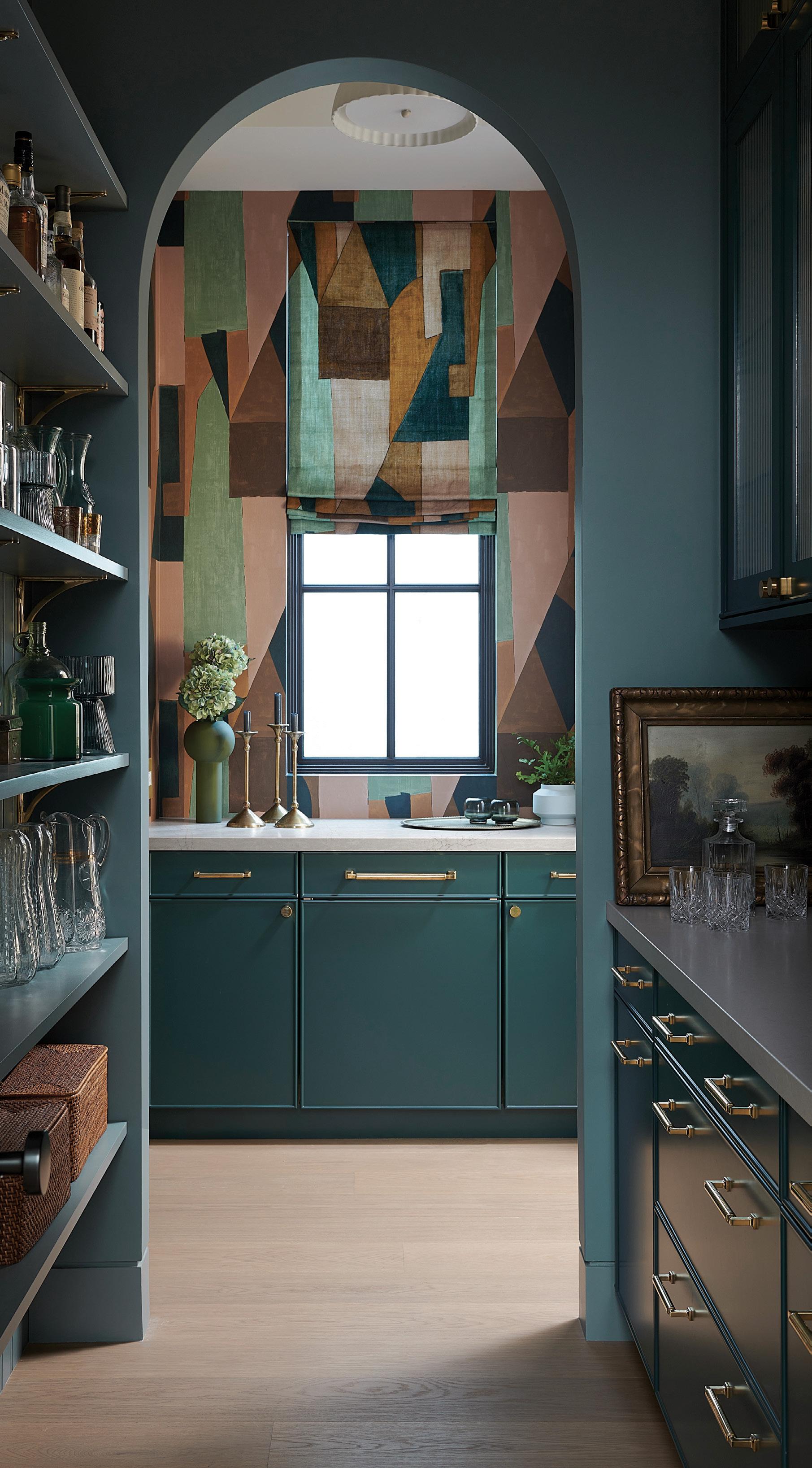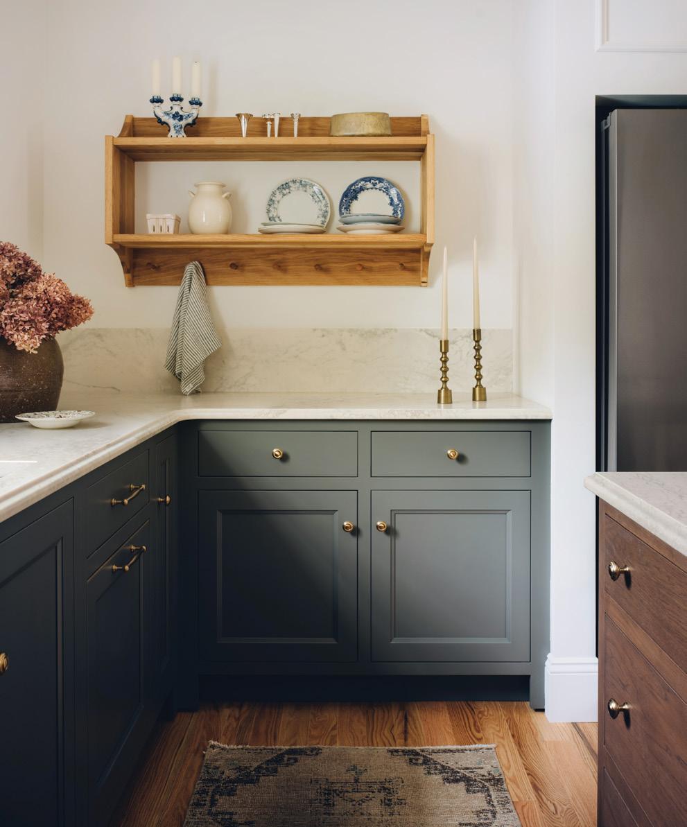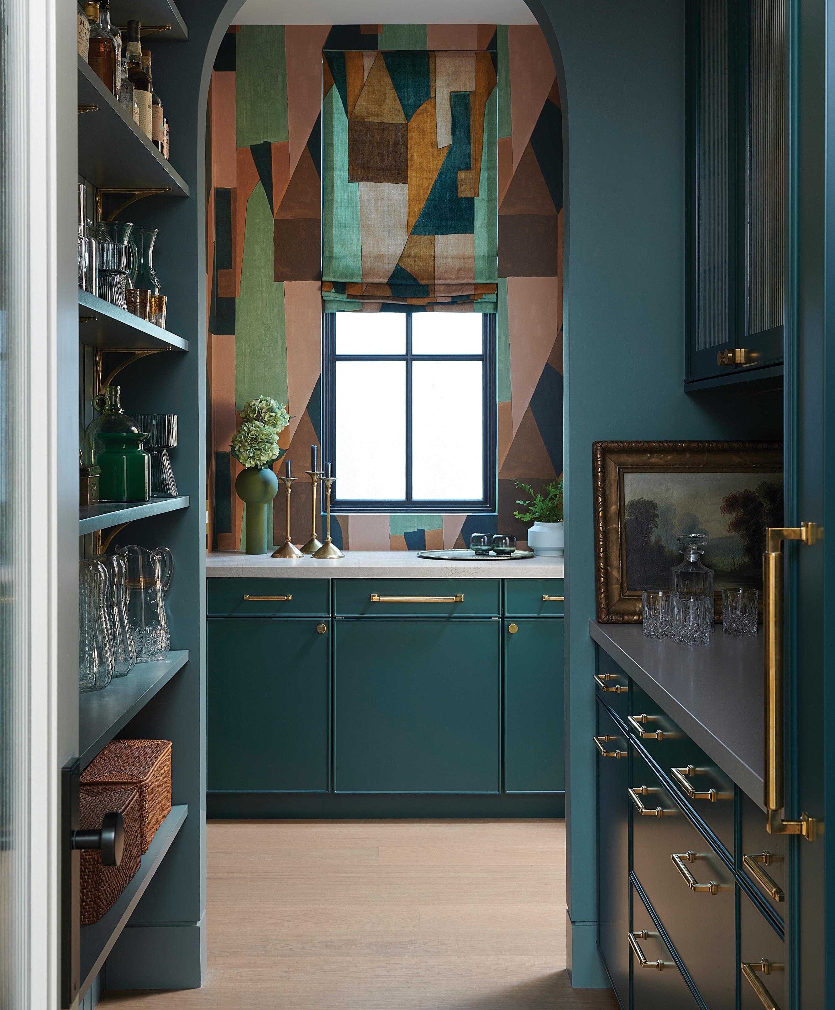 Unlacquered brass shelf brackets from Etsy, etsy.com. Cabinetry from Ström Cabinetry, stromcabinetry.com. Haniburton cabinetry hardware from Schaub, schaubandcompany.com. District Paper in tobacco by Kelly Wearstler from Kravet, kravet.com. Custom roman blind from Parallele Interiors, paralleleinteriors.com. Cabinet color in Tarrytown; wall color in Templeton Gray, all by Benjamin Moore, benjaminmoore.com