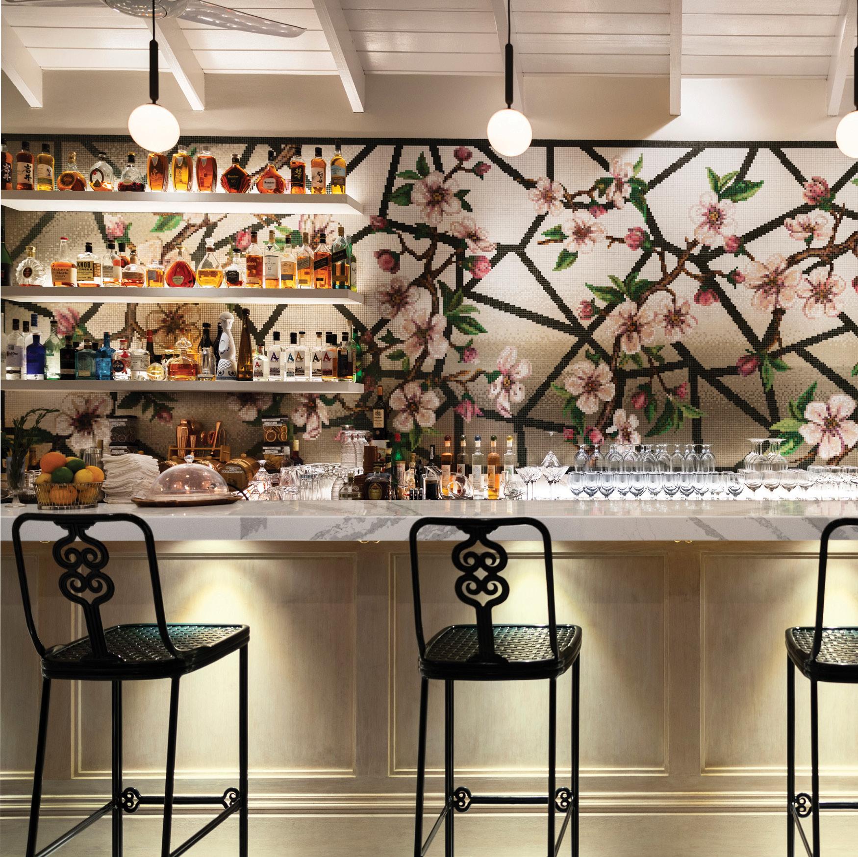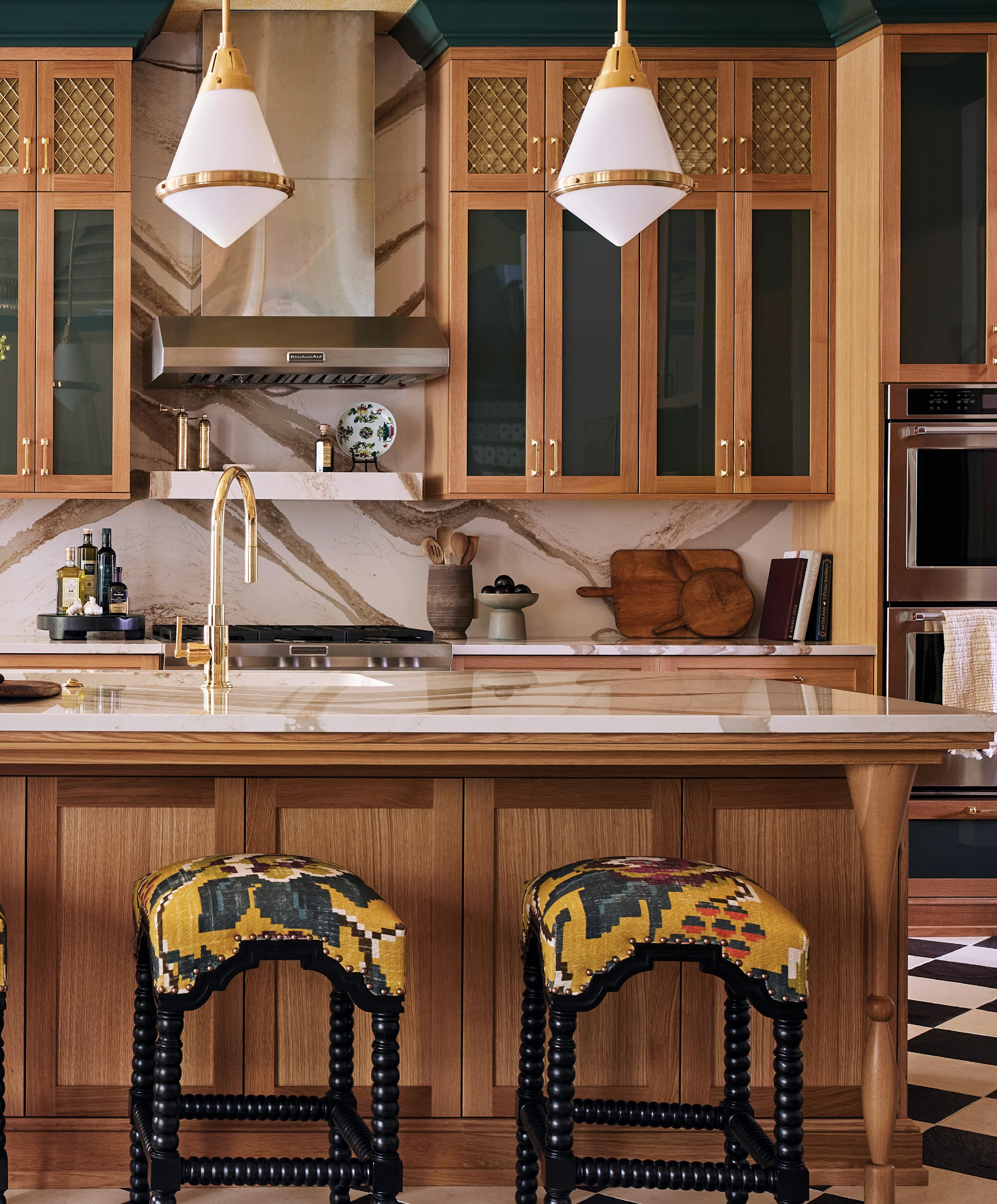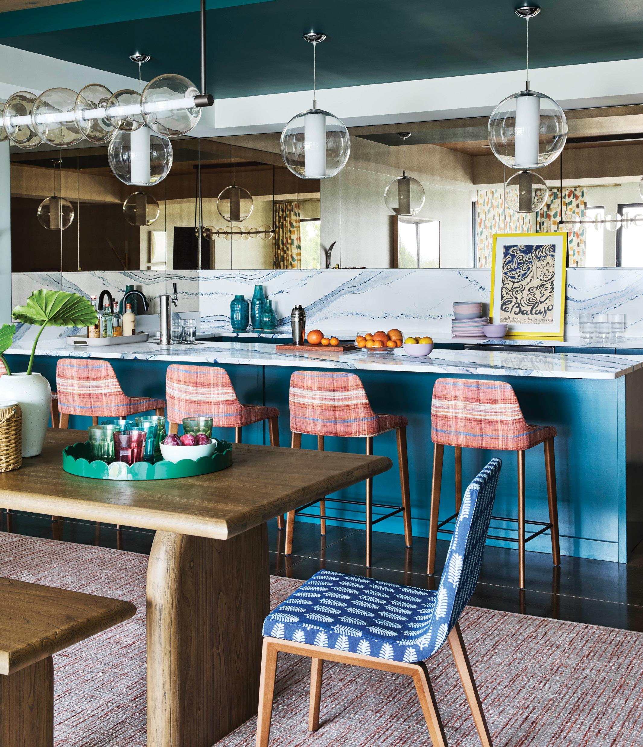 Hands, fourhands.com. Accent dining chair in Kravet fabric and counter schools from Andreu World, andreuworld.com. Lighting fixtures from Viso Lighting, visoinc.com. Rug from Rug & Kilim, rugandkilim.com