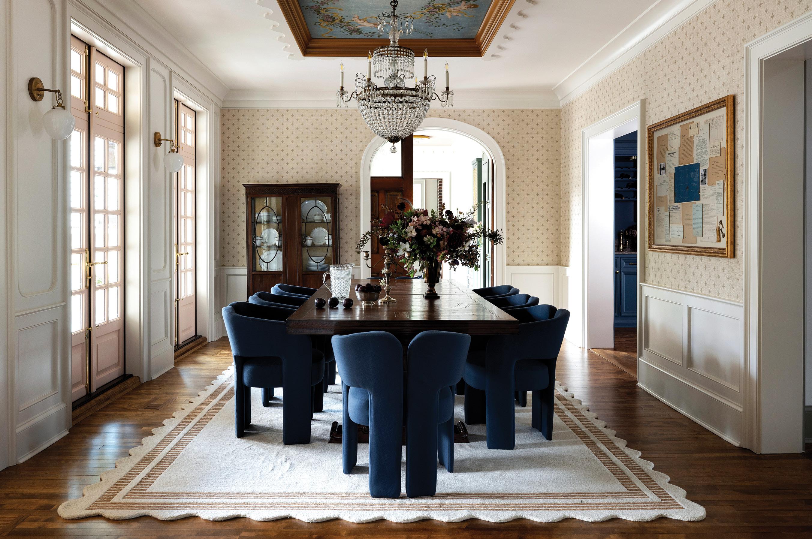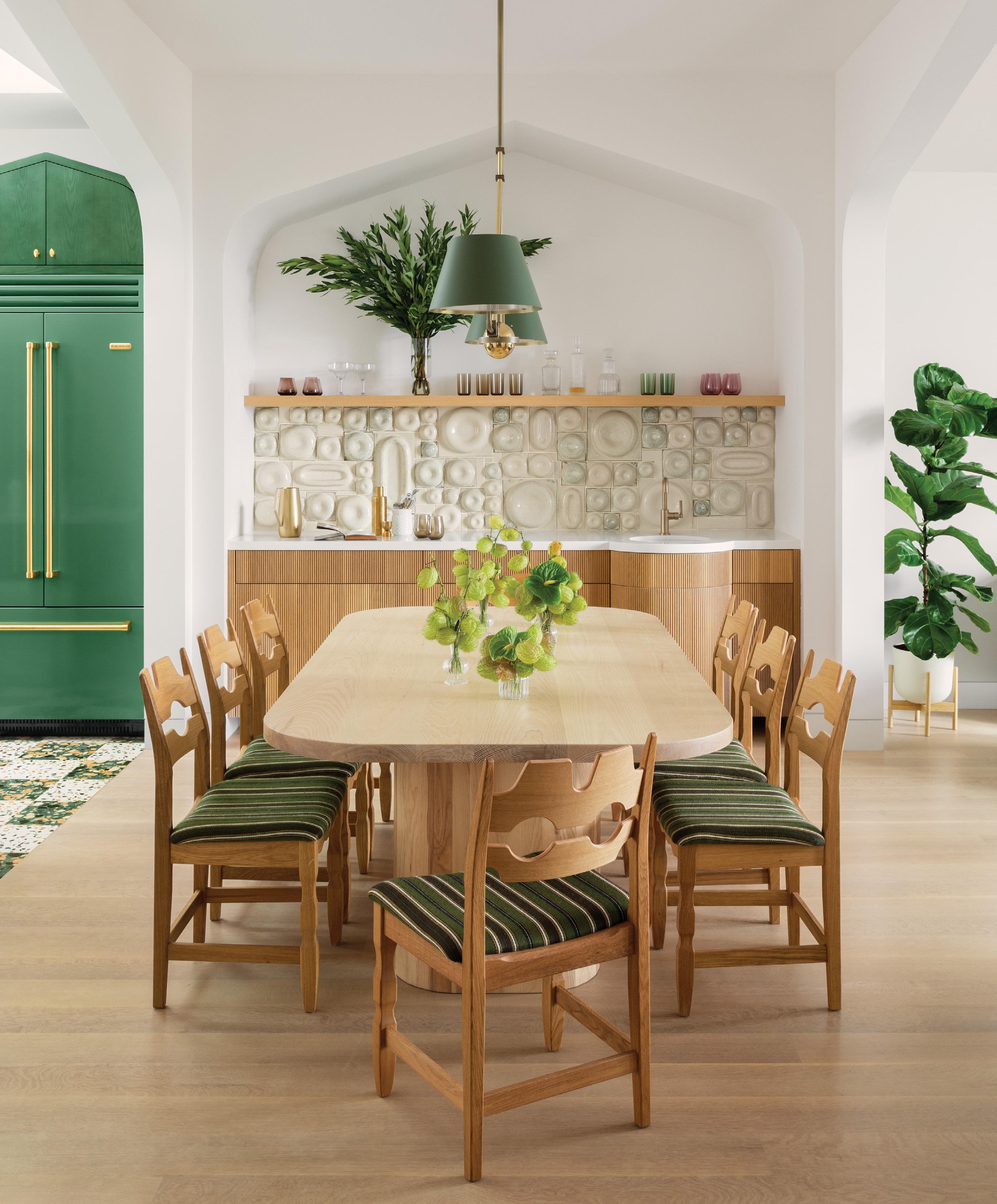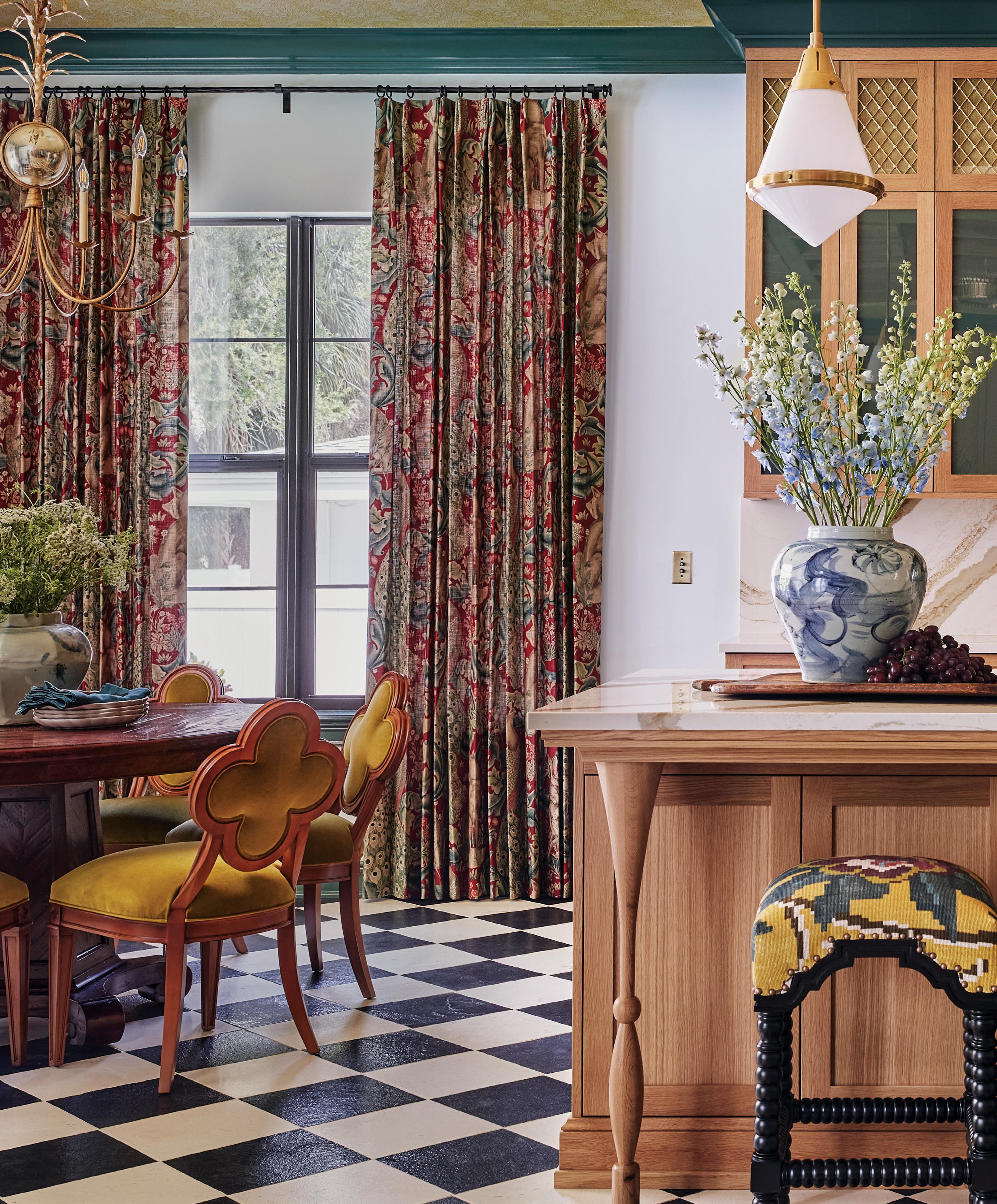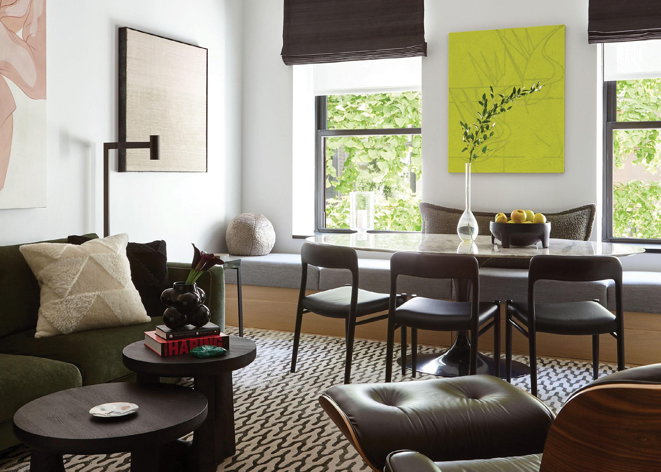 Hands, fourhands.com. Accent dining chair in Kravet fabric and counter schools from Andreu World, andreuworld.com. Lighting fixtures from Viso Lighting, visoinc.com. Rug from Rug & Kilim, rugandkilim.com