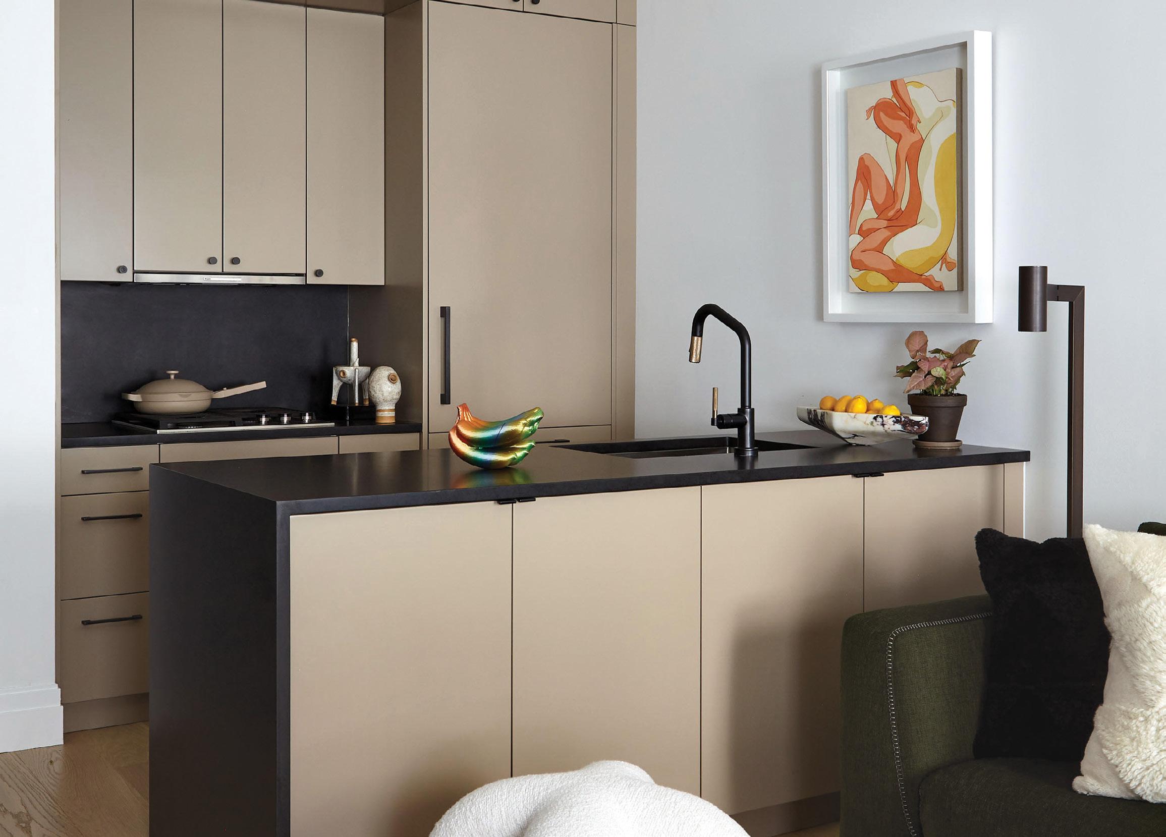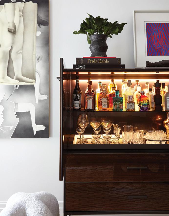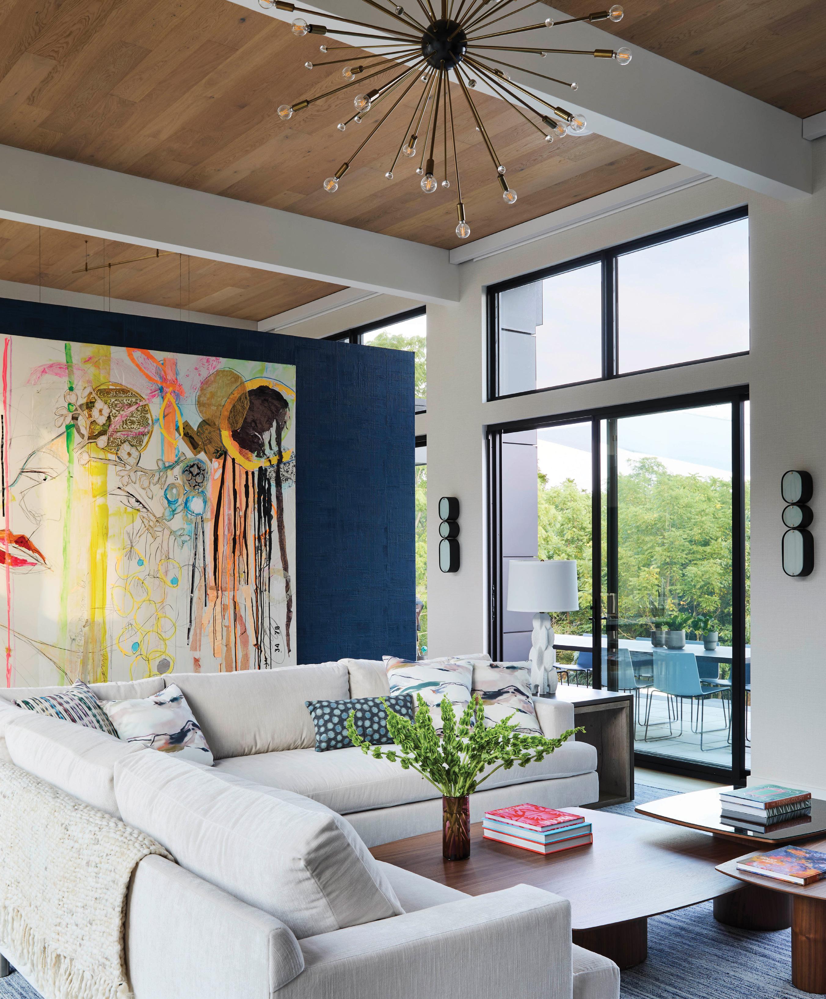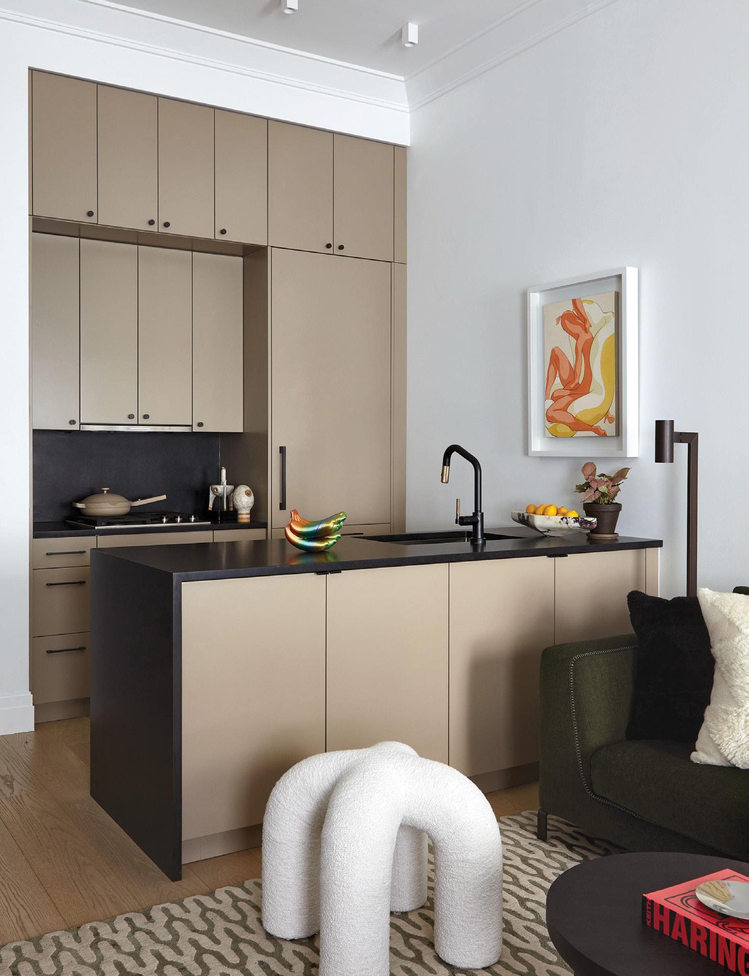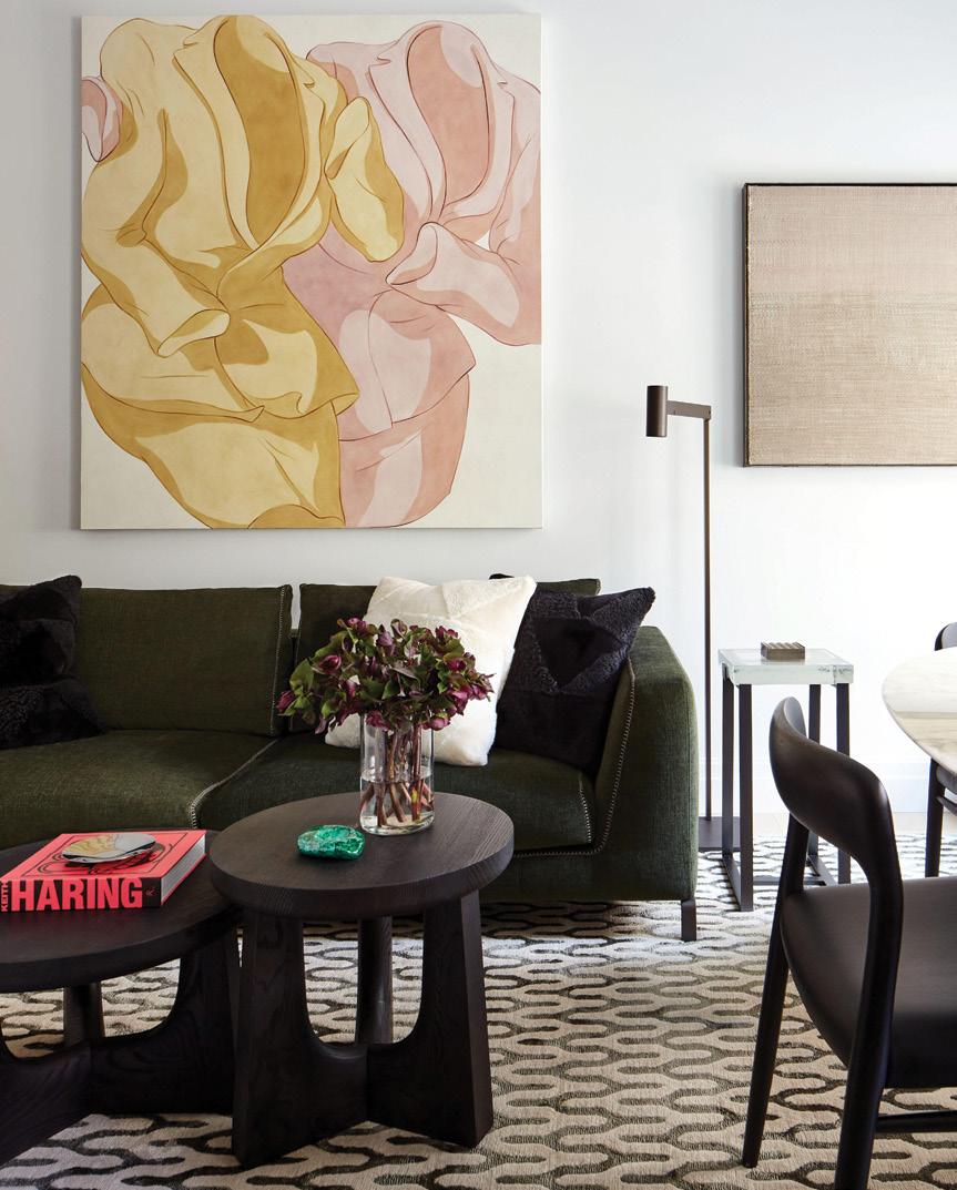 LIVING ROOM & KITCHEN PG 20: Countertop and backsplash in Black Rock by Cambria, CambriaUSA.com. Kitchen cabinets from The Breakfast Room, thebreakfastroom.com. Sofa from B&B Italia, bebitalia.com. Throw pillows from Lorin Marsh, lorinmarsh.com. Rug from The Rug Company, therugcompany.com. Coffee nesting tables from Poliform, poliform.it. Floor lamps from Nahoor, nahoor.com. Art above sofa and in kitchen by Ivy Haldeman from Tara Downs Gallery, taradowns.com