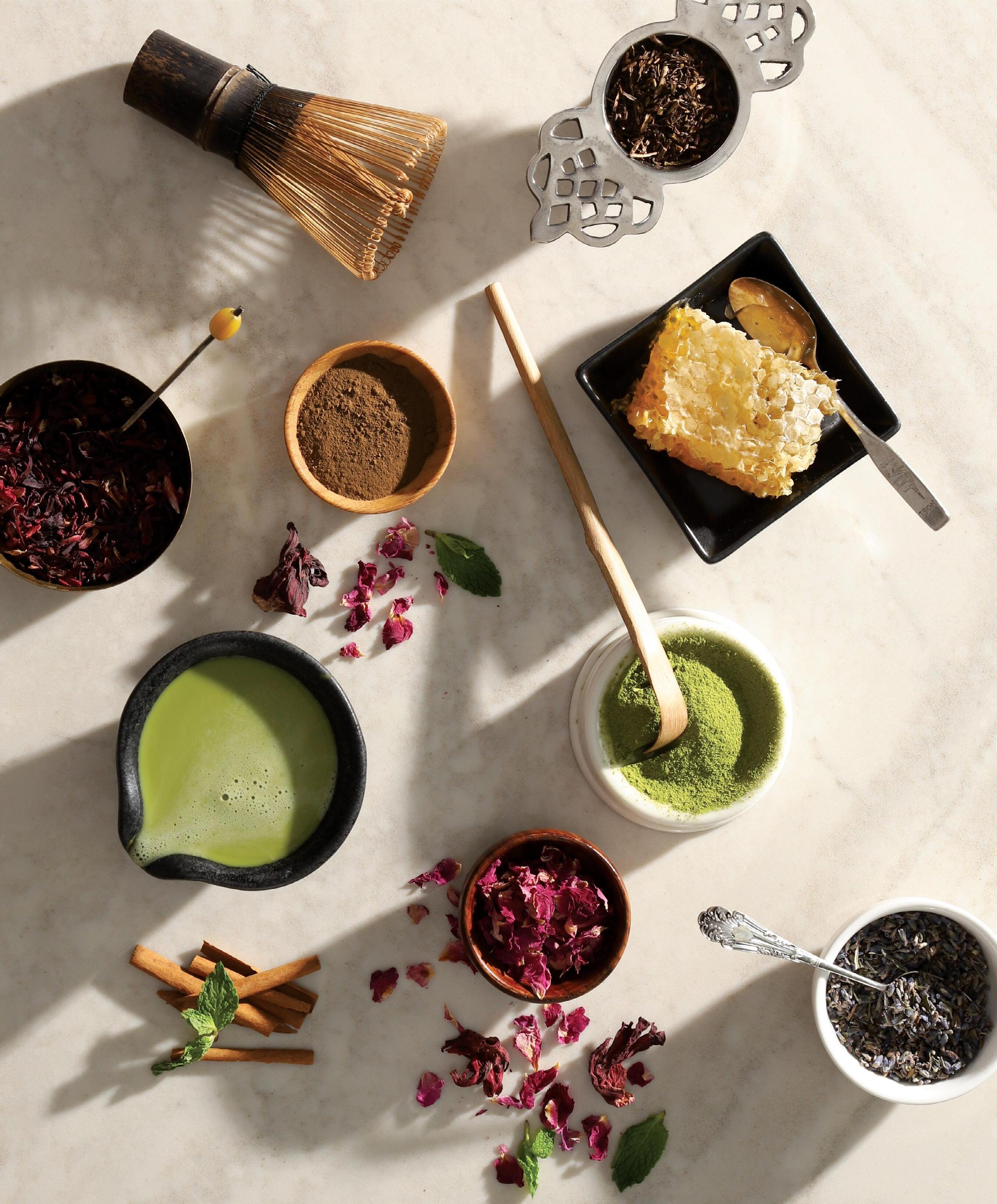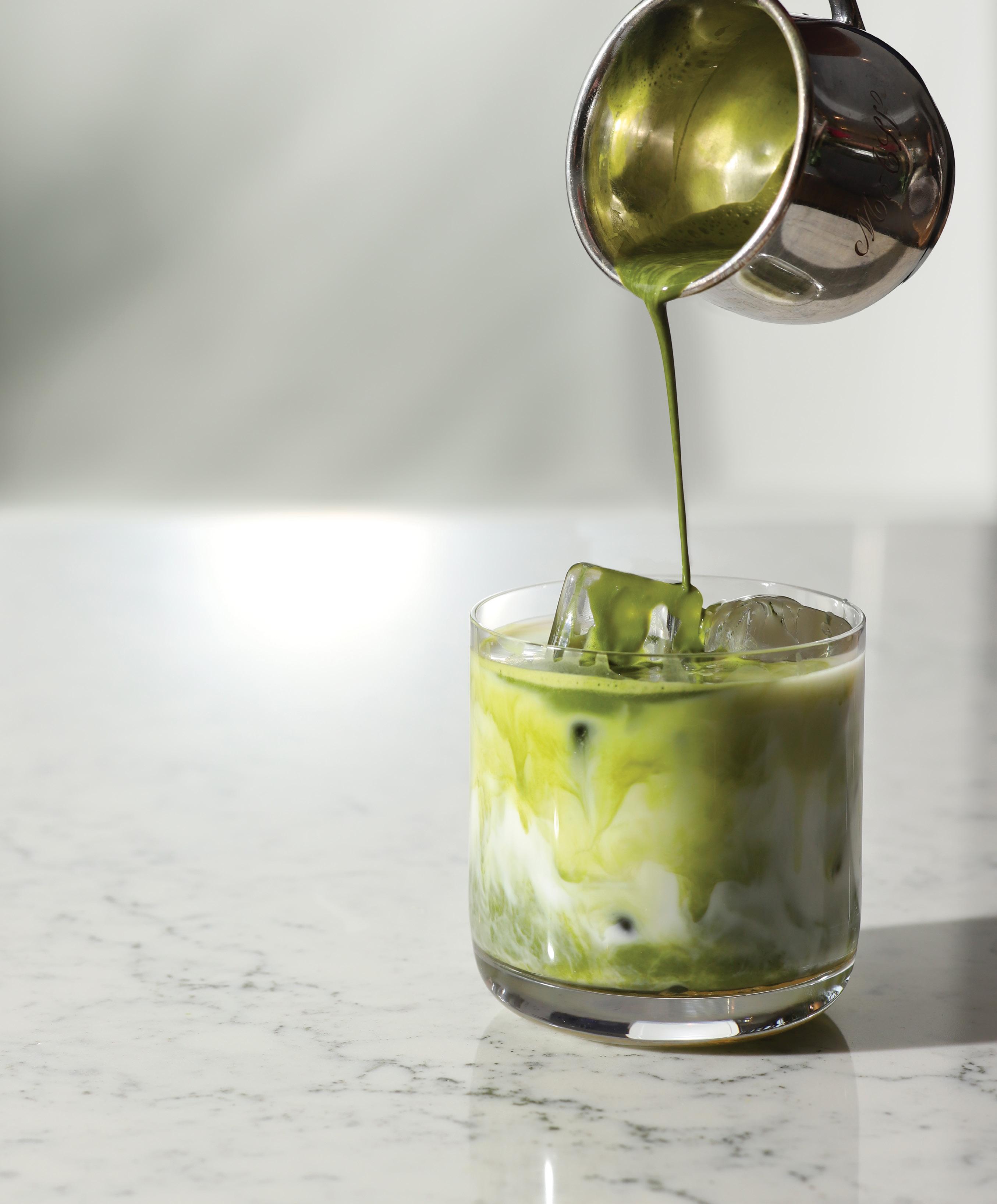 PG 59: Countertop in Everleigh Warm by Cambria, CambriaUSA.com. Seven-piece gold matcha set with ceramic bowl, bamboo whisk and holder, sifter, and tea scoop from Amazon, amazon.com