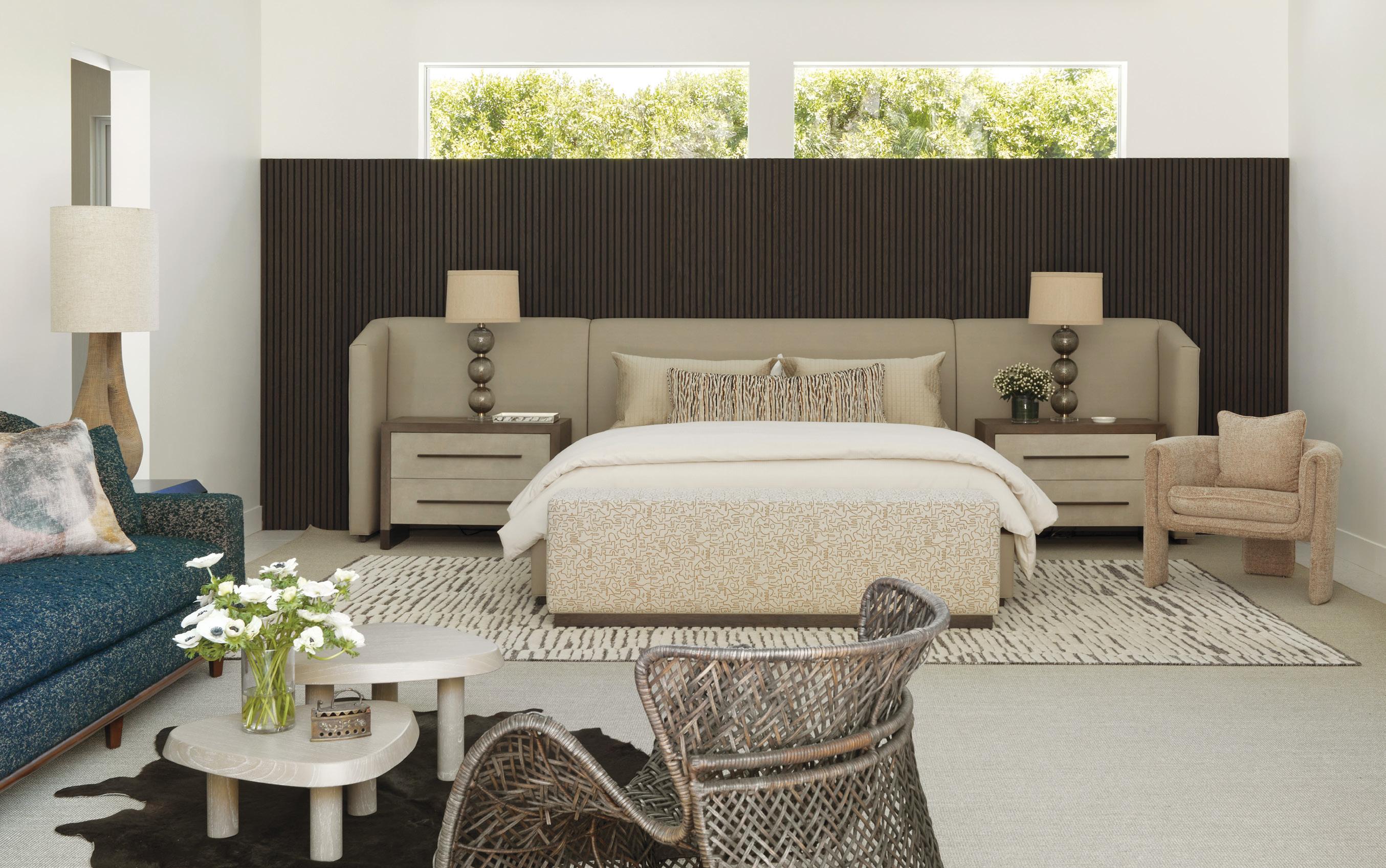 BEDROOM PG 41: Custom upholstered bed, bench, and sofa. Woven chair from Arteriors, arteriorshome.com. Vintage Italian Murano bedside lamps.