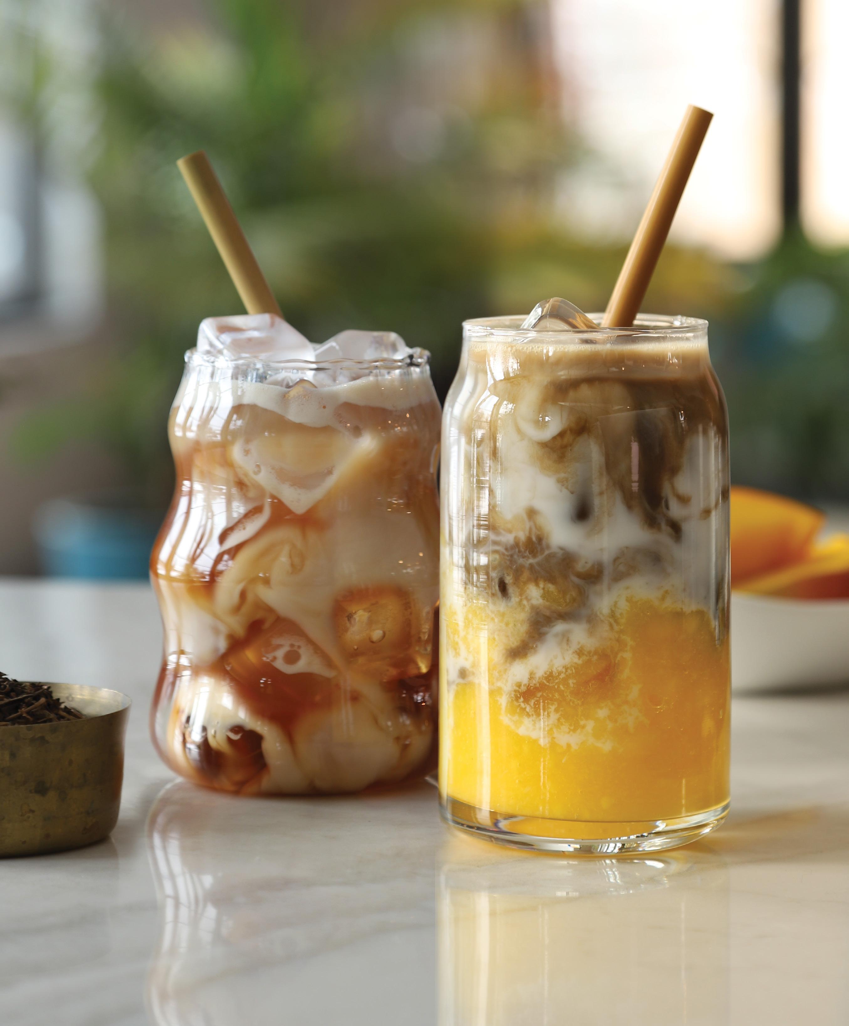PG 60: Countertop in Everleigh Warm by Cambria, CambriaUSA.com. Coffee tumbler glasses and bamboo straws from Amazon, amazon.com