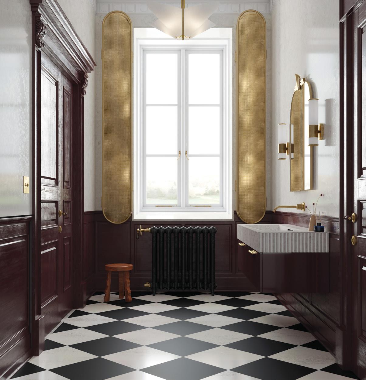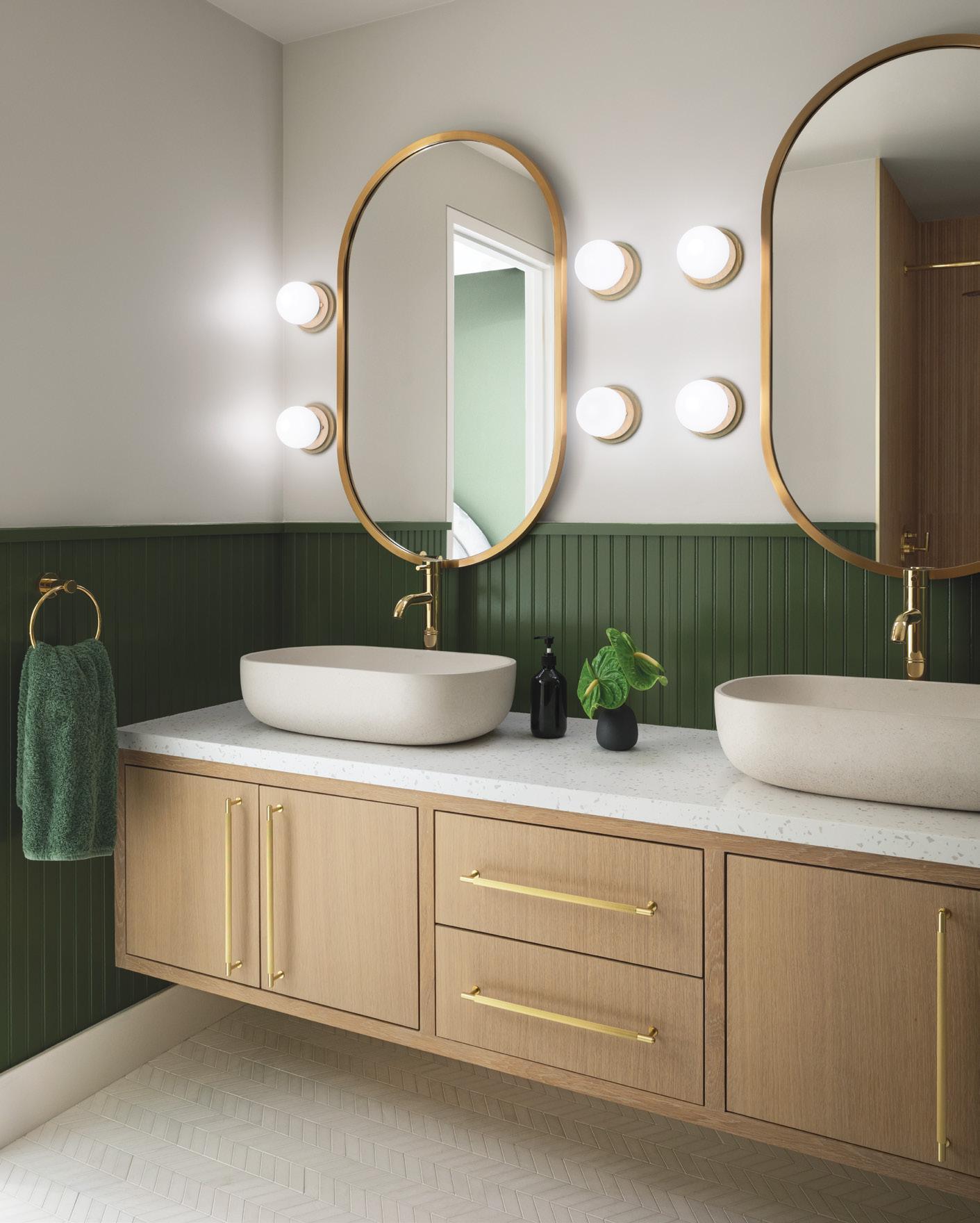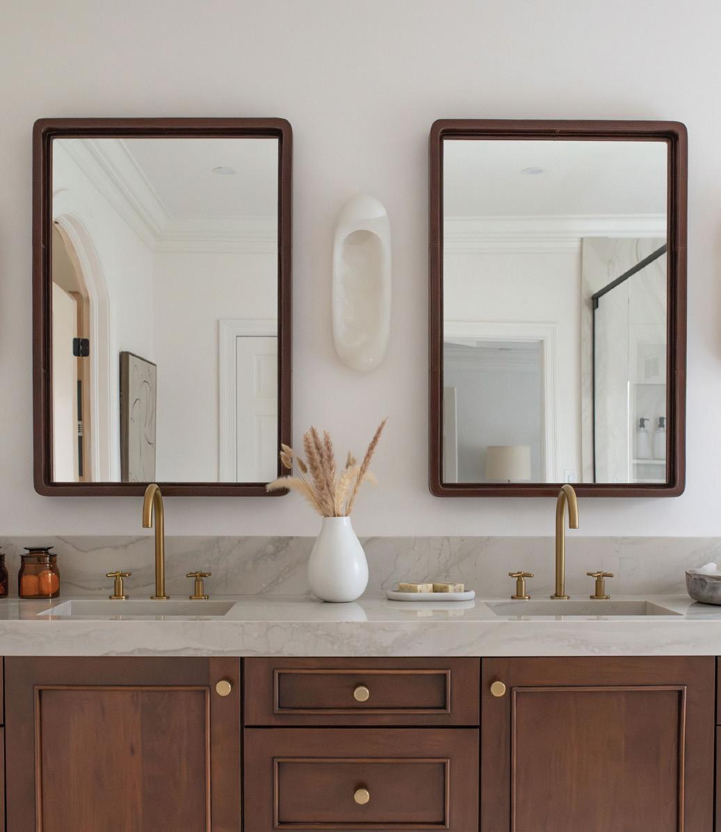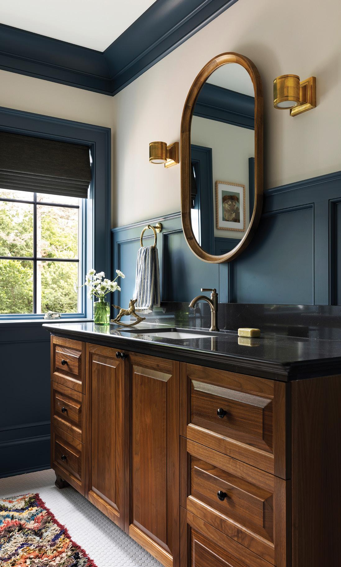 BATHROOM PG 27: Vanity countertop in Salt Lake by Cambria, CambriaUSA.com Wall and ceiling color in Edgecomb Gray and wainscotting in Jade Romanesque by Benjamin Moore, benjaminmoore.com. Canal mirrors in brushed brass from Lightology, lightology.com. Marble sconce by Worley’s Lighting, worleyslighting.com. Loft extended monoblock faucets in brass from Watermark Designs, watermark-designs.com. Rho basins in ivory by Kast Concrete Basins, kastconcretebasins.com. Thassos marble mosaic floor tile in chevron pattern from Artistic Tile, artistictile.com