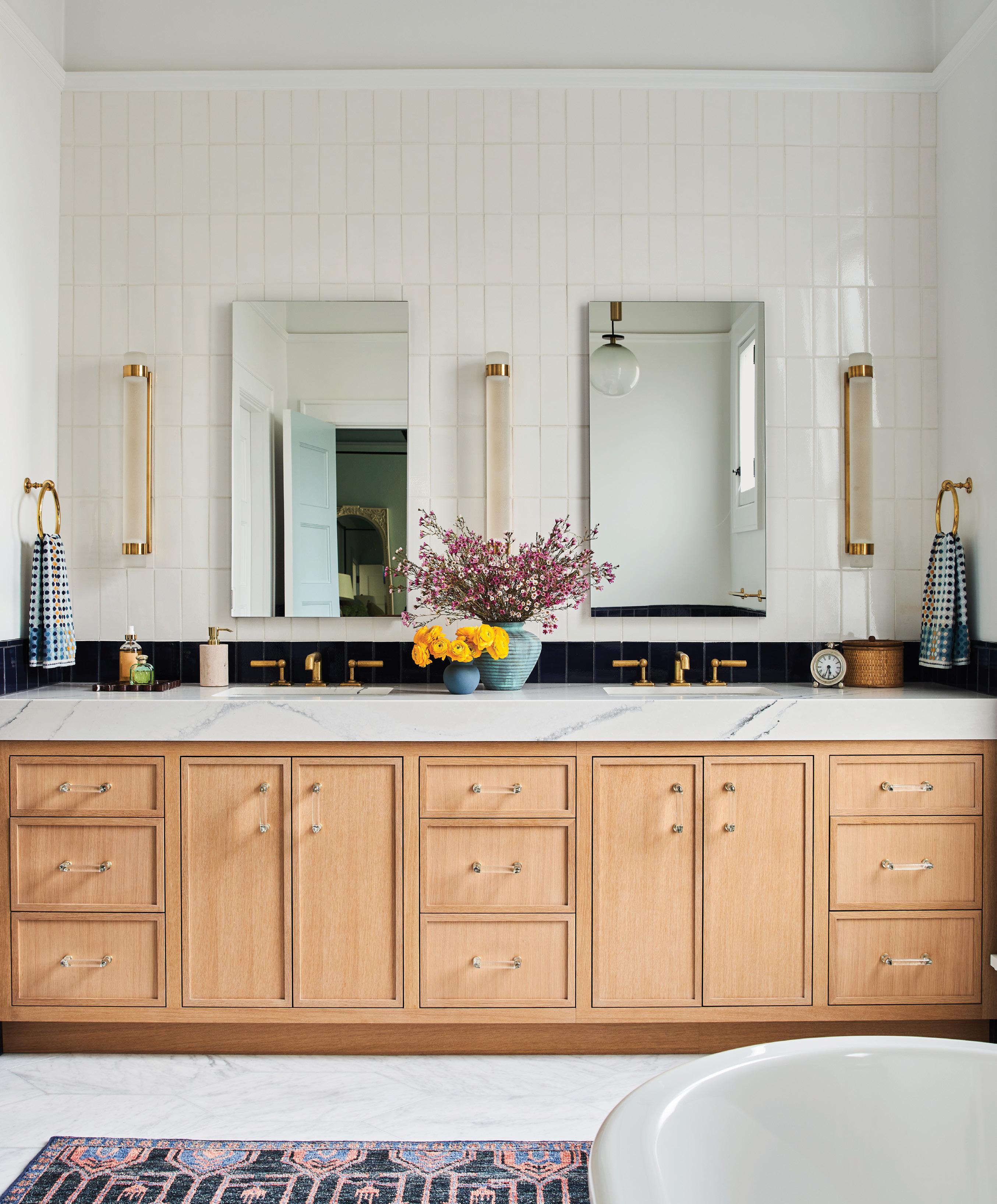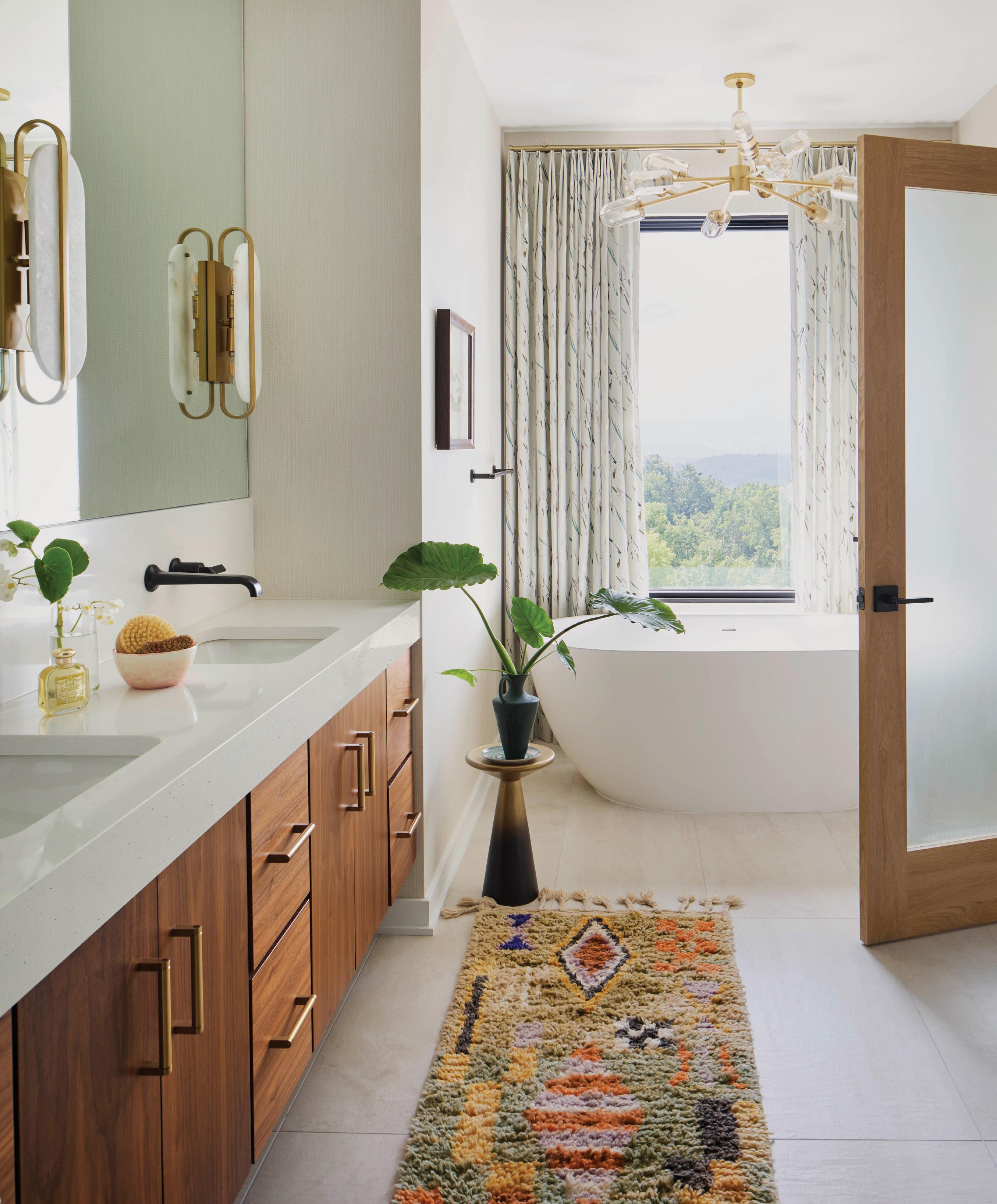 BATHROOM PG 48: Vanity countertop in Minnesota Snow by Cambria, CambriaUSA.com. Sconces and chandelier from Arteriors, arteriorshome.com. Vintage rug. Tub from Kallista, kallista.com. Cabinetry hardware from Top Knobs, topknobs.com
