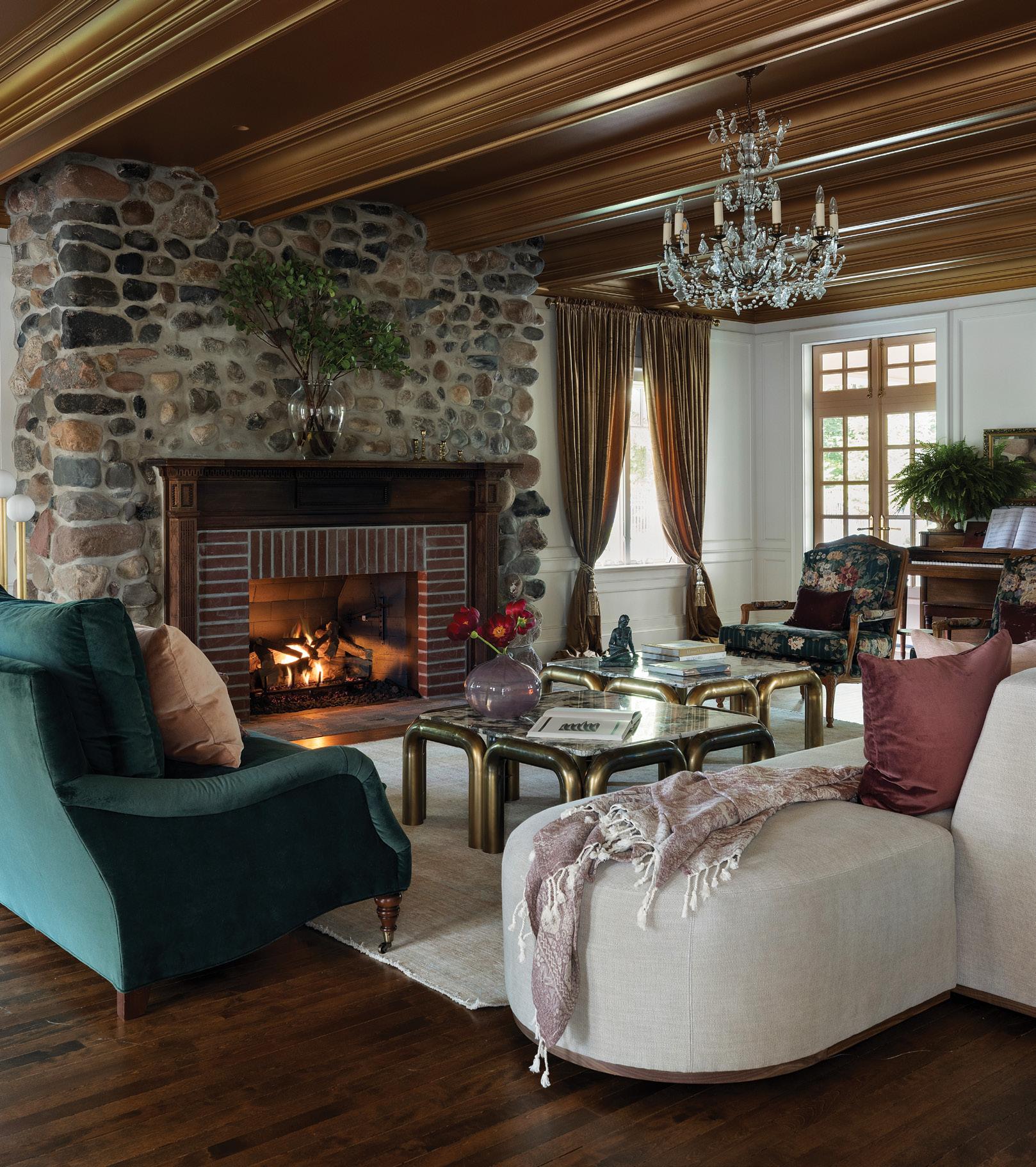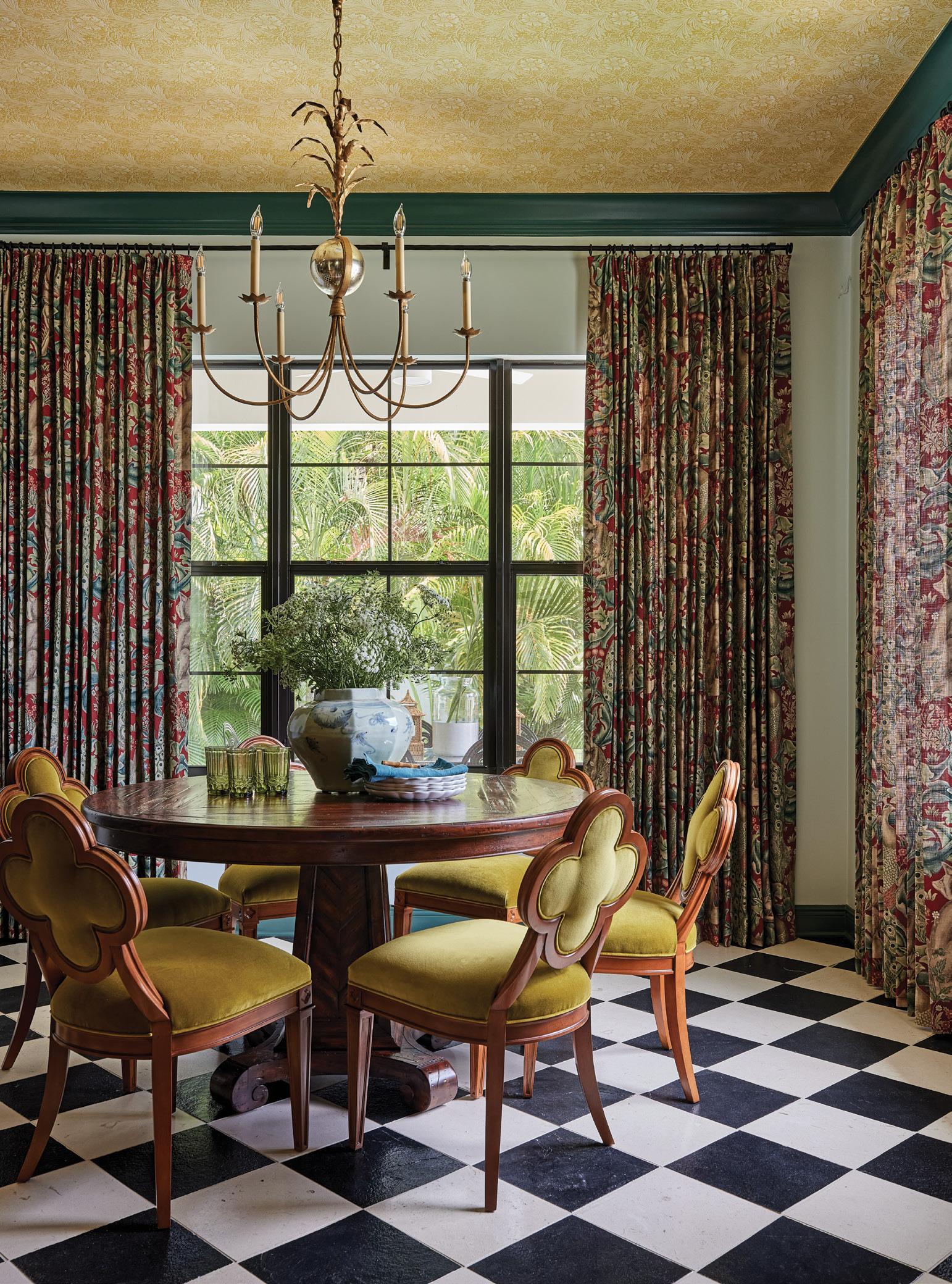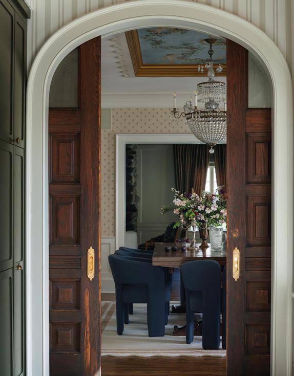 DINING AREA PG 34: Elaborate mahogany wood center table from Theodore Alexander, theodorealexander.com. Alexandra mohair dining chairs in standard light walnut finish from Hickory Chair, hickorychair.com. Rocky performance velvet dining room chair fabric in chartreuse from Schumacher, schumacher.com Forest linen drapery fabric in red from Morris & Co, wmorrisandco.com. Gramercy medium chandelier in gilded iron from Visual Comfort, visualcomfort.com. Marigold wallpaper in yellow by Morris & Co, wmorrisandco.com. LIBRARY PG 36: Reed single sconce in antique brass and Soleil large semi flush light in antique brass from Visual Comfort, visualcomfort.com. Bristol 85" sofa and Tinsley chair from Rowe, rowefurniture.com