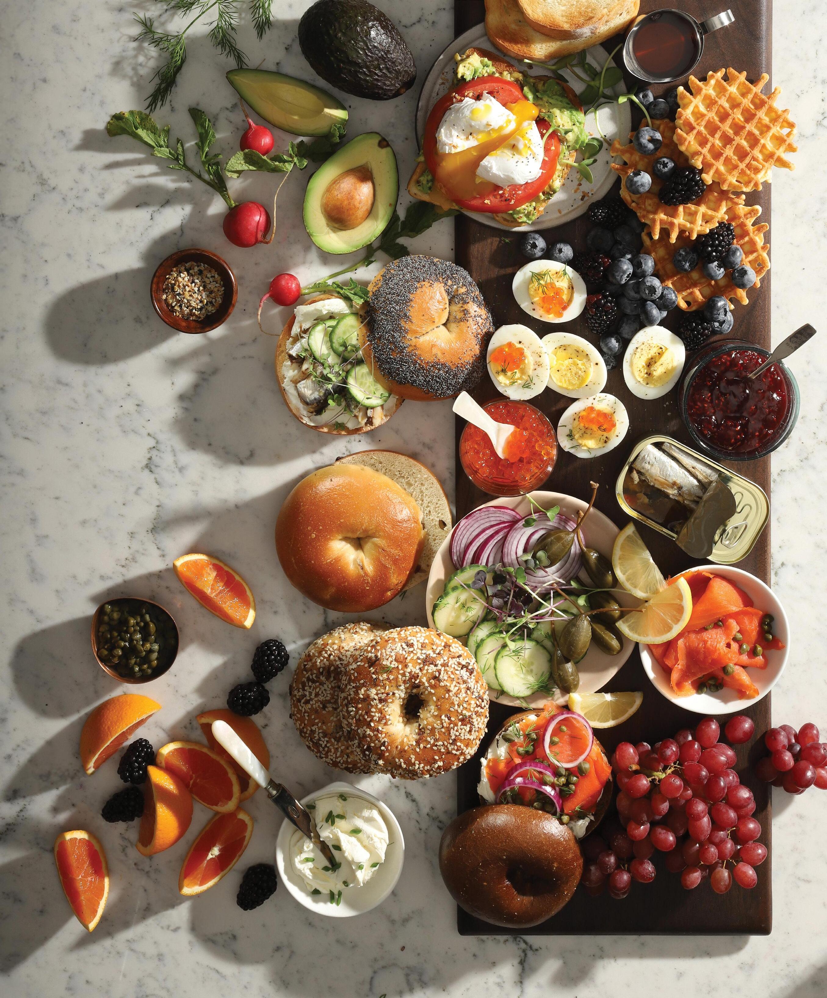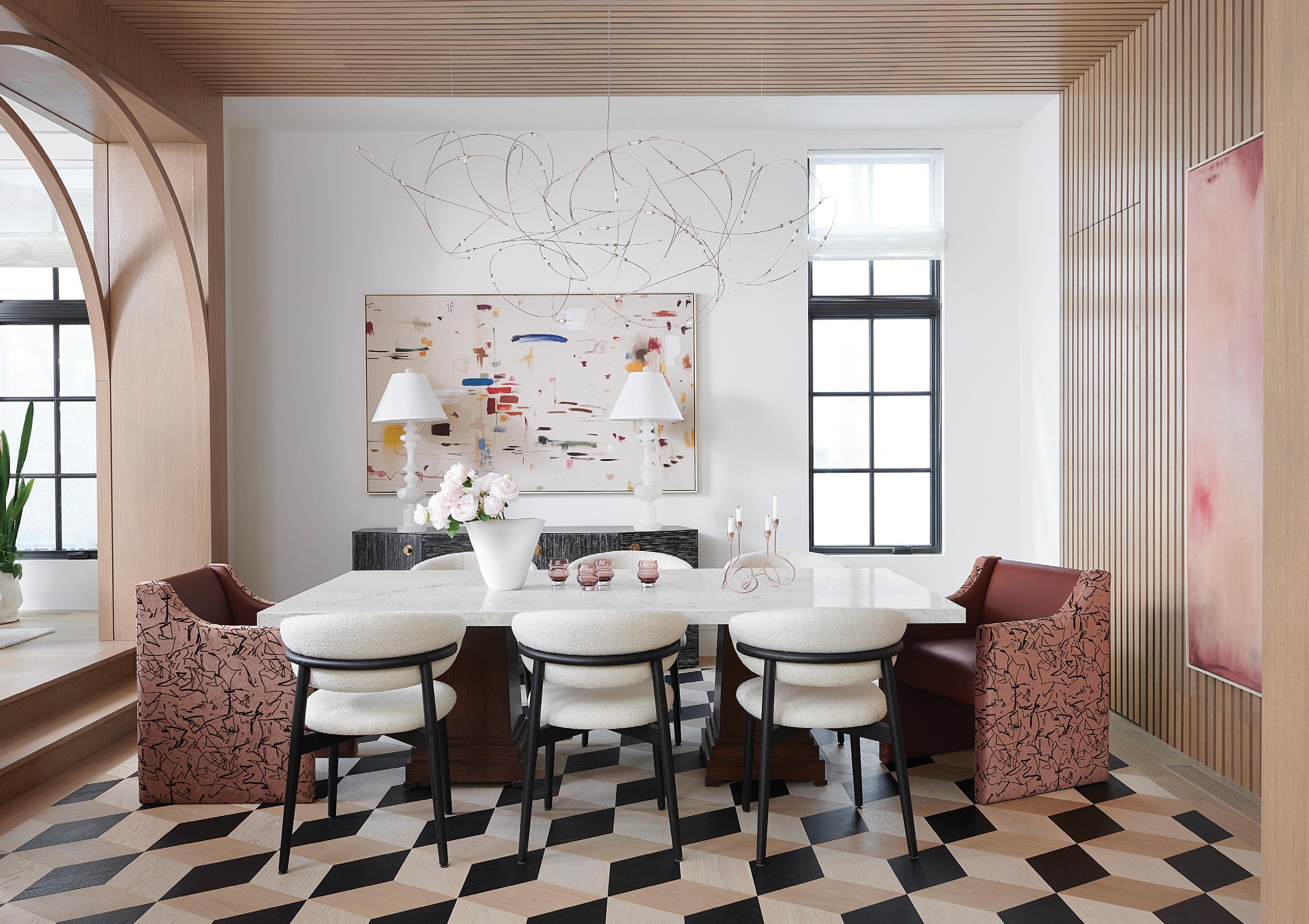 Custom head chairs in scribble recycled amber fabric from Kirkby Design, kirkbydesign.com Oleandro chair in Paris cream from Calligaris, calligaris.com. Vergal sideboard in black from Sonder Living. Farrington white table lamps from Currey & Company, curreyandcompany.com. Ink Mix and Painters Palette artwork from Wendover Art Group, wendoverart.com. Moooi flock of light chandelier from Robinson Lighting & Bath, robinsonco.ca. Custom designed flooring. PANTRY PG D-66: Countertop in Templeton and Delgatie by Cambria, CambriaUSA.com