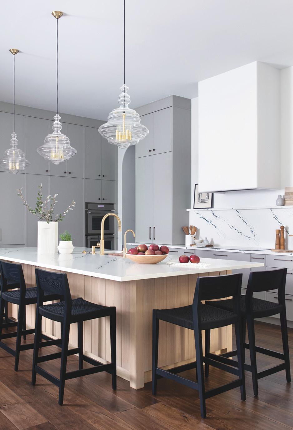KITCHEN PG 28 & 29: Waterfall island and perimeter countertops and backsplash in Ironsbridge by Cambria, CambriaUSA.com Custom cabinets in Rubio Sky Grey matte finish fabricated by Mint Hill Cabinets, minthillcabinets.com. Cabinet hardware from Top Knobs, topknobs.com. Desmond lantern pendants from Visual Comfort, visualcomfort.com. Dylan wall sconce by Mitzi, mitzi.com. Range by Wolf, subzero-wolf.com. Rook faucet by Brizo, brizo.com. Stools from Cyan Design, cyan.design. Refrigerator by Sub-Zero, subzero-wolf.com