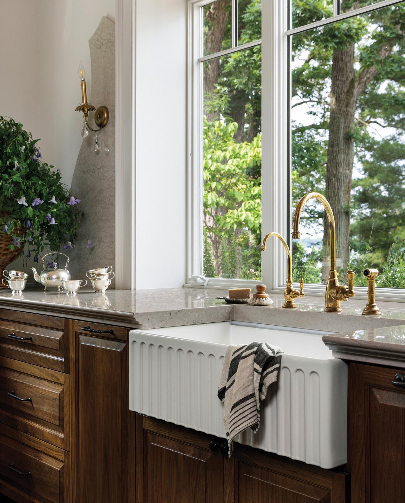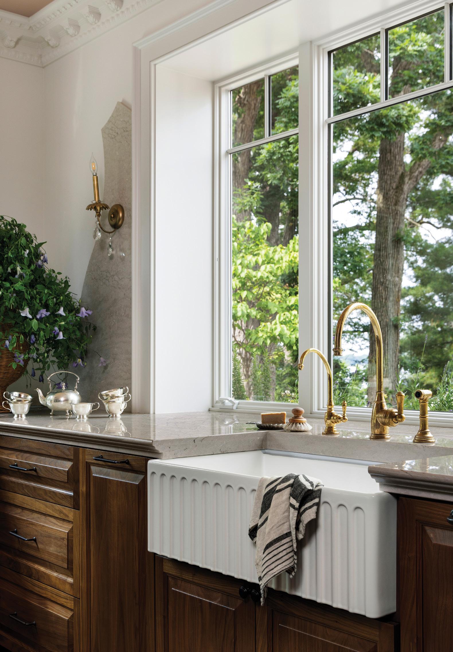 DESIGNER: Blue Pencil Collective, bluepencilcollective.com; BUILDER: Robey Construction, robeyconstruction.com. KITCHEN PG 17: Perimeter countertop and scalloped backsplash in MonTaaj by Cambria, CambriaUSA.com. Faucet from House of Rohl, houseofrohl.com. Sink from Forte Brands, fortebrands.com. Wall color in White Duck by Sherwin Williams,