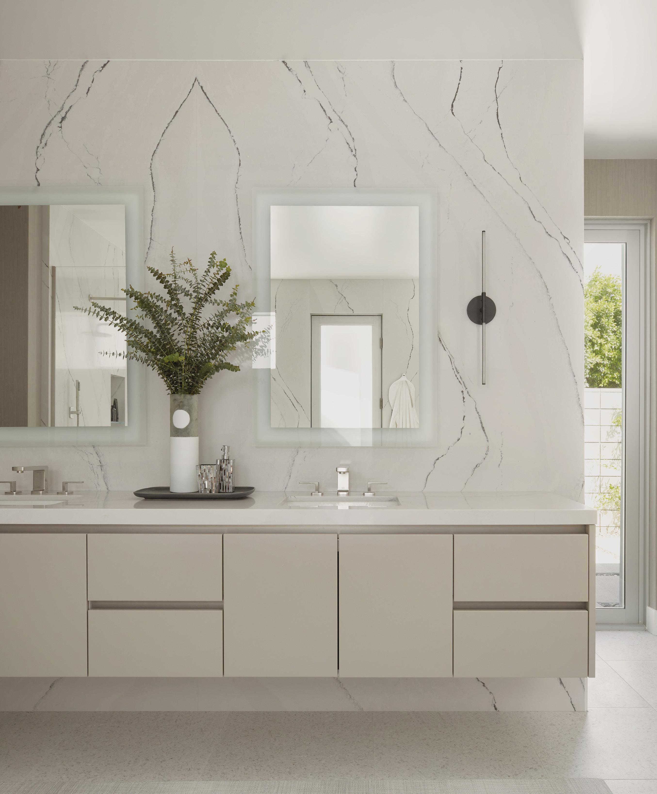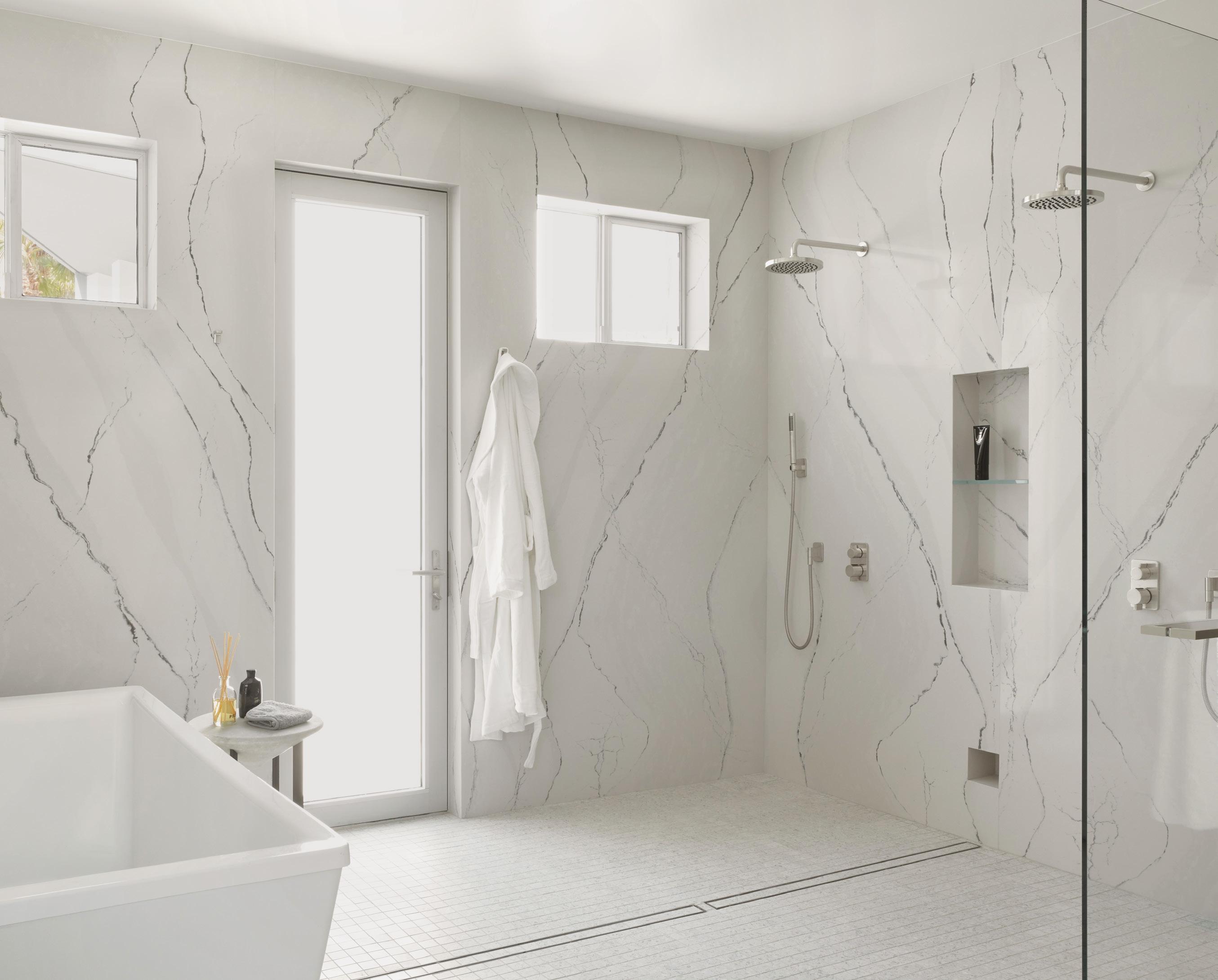 BATHROOM PG 42 & 43: Vanity countertop, wall cladding, and shower surround in Gladstone by Cambria, CambriaUSA.com.