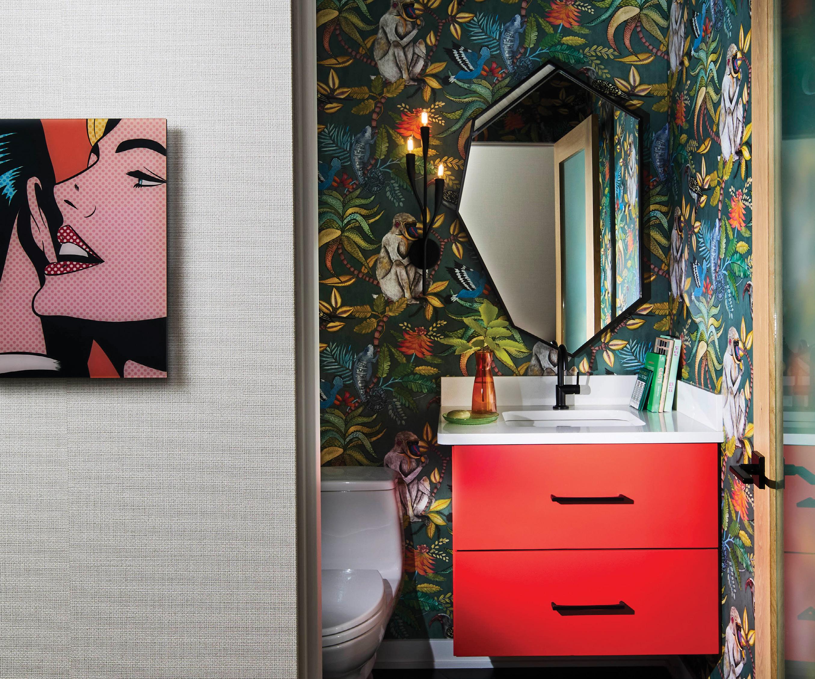 POWDER ROOM PG 47: Vanity countertop in Whitehall by Cambria, CambriaUSA.com Vanity cabinet by McCloskey Builders, mccloskeybuilders.com. Wallpaper from Cole & Son, cole-and-son.com. Faucet from Brizo, brizo.com. Sconce from Hudson Valley Lighting, hvlgroup.com. Mirror from Arteriors, arteriorshome.com