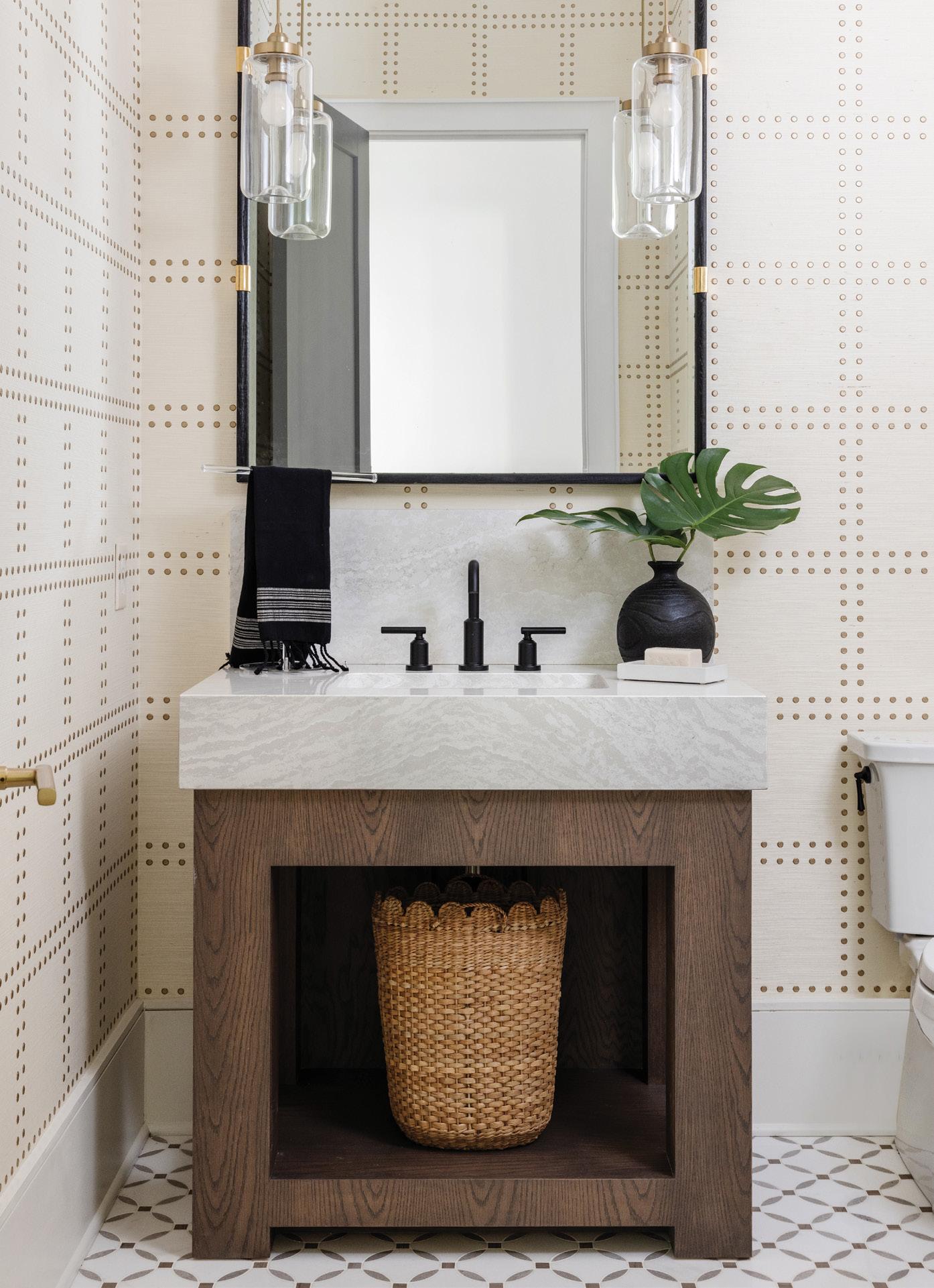 BATHROOM PG 17: Vanity countertop and detailing in Abbey by Cambria, CambriaUSA.com. Wallpaper from Rifle Paper, riflepaperco.com. Door color in Mannered Gold by Sherwin Williams, sherwin-williams.com. Hardware from Zara Home, zarahome.com. Faucet from Delta, deltafaucet.com