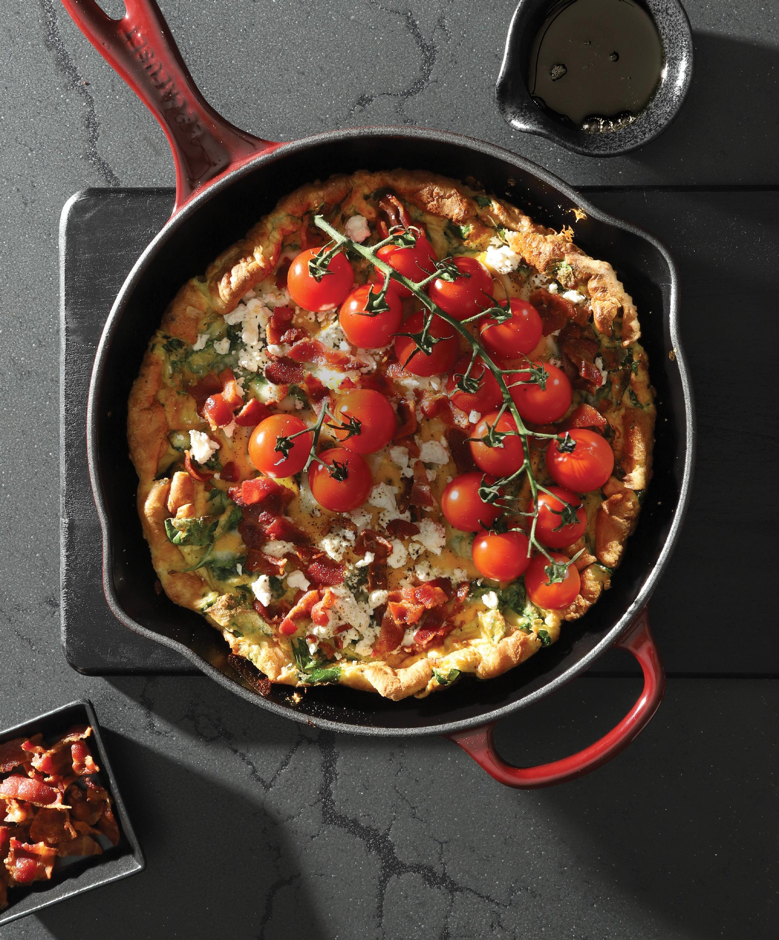 PG 54: Countertop in Inverness Stonestreet by Cambria, CambriaUSA.com. Le Creuset cast iron skillet. Vintage cutting board.