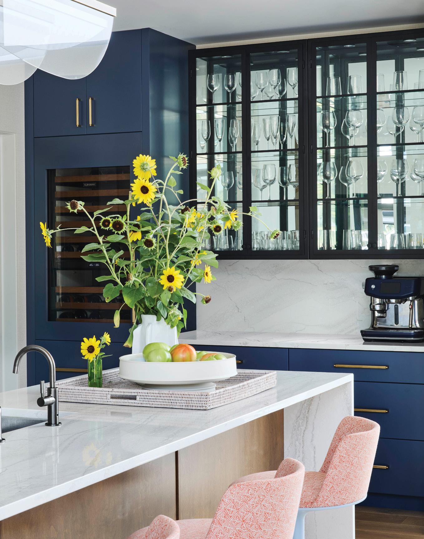 KITCHEN PG 45 & 46: Waterfall island and perimeter countertops and backsplash in Inverness Everleigh by Cambria, CambriaUSA.com. Stools upholstered in Perennials fabric from Andreu World, andreuworld.com. Regina Andrew chandelier and sconces from Visual Comfort, visualcomfort.com. Faucets from Brizo, brizo.com. Wine fridge from Sub Zero, subzero-wolf.com. Cabinet hardware from Top Knobs, topknobs.com. Custom colored cabinets by McCloskey Builders, mccloskeybuilders.com