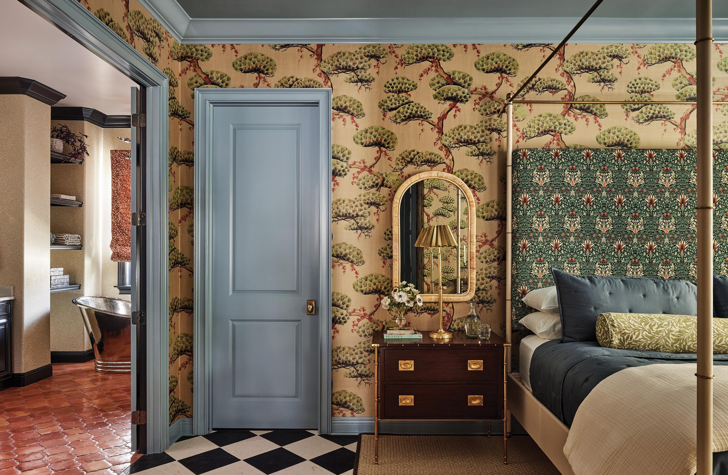 Custom brass lamp from Matilda & Goad, matildagoad.com. Brienne wall mirror from Cooper Classics, cooperclassics.com Tomaso chest side table in mahogany & brass from Theodore Alexander, theodorealexander.com. Momiji wallpaper from Pierre Frey, pierrefrey.com