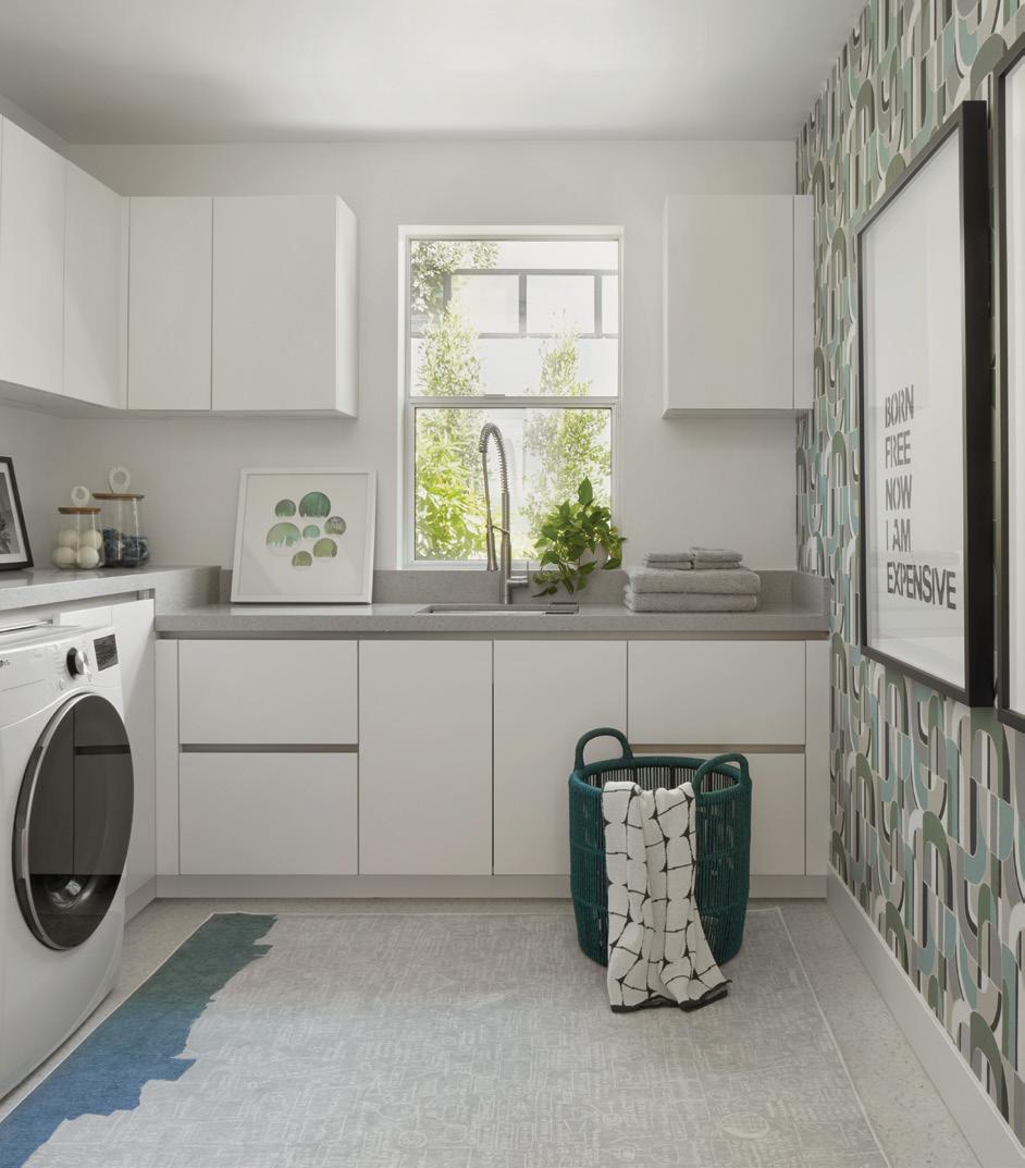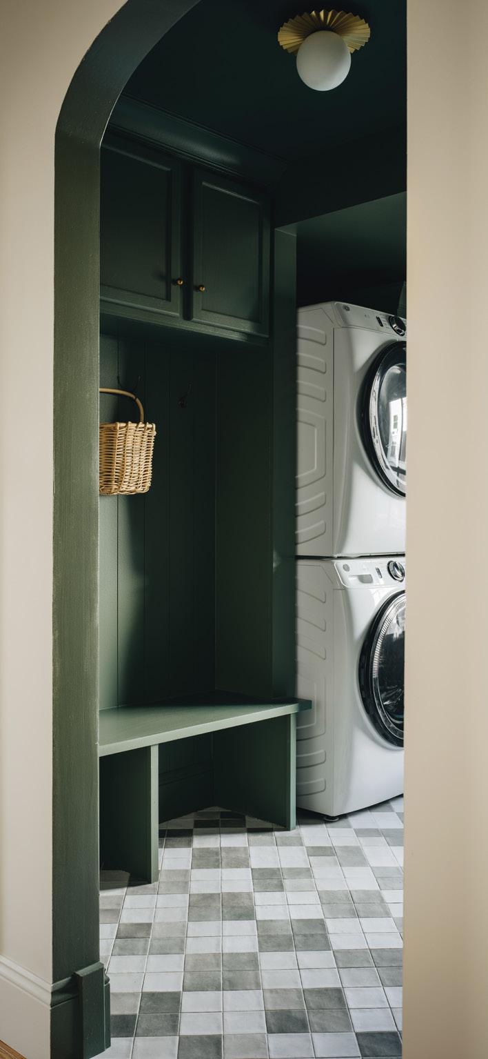 LAUNDRY ROOM PG D-69: GE stacked washer and dryer from Lowe’s, lowes.com. Custom cabinetry and wall color in Rainy Afternoon by Benjamin Moore, benjaminmoore.com. Light fixture from Wayfair, wayfair.com. Celine 4x4 tile from Bedrosians, bedrosians.com