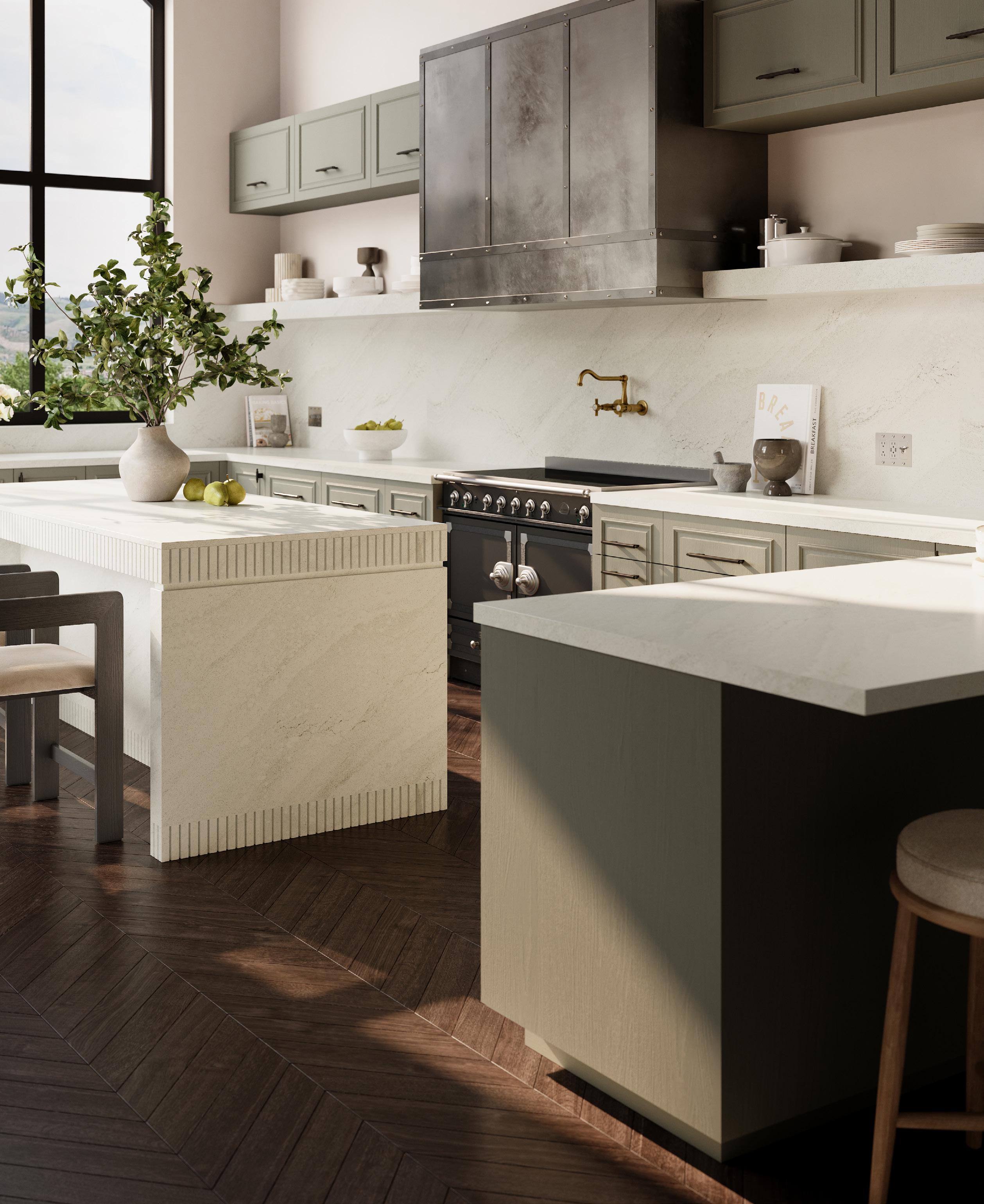 KITCHEN PG 38 & 40: Waterfall island and perimeter countertops and backsplash in Lakedale by Cambria, CambriaUSA.com