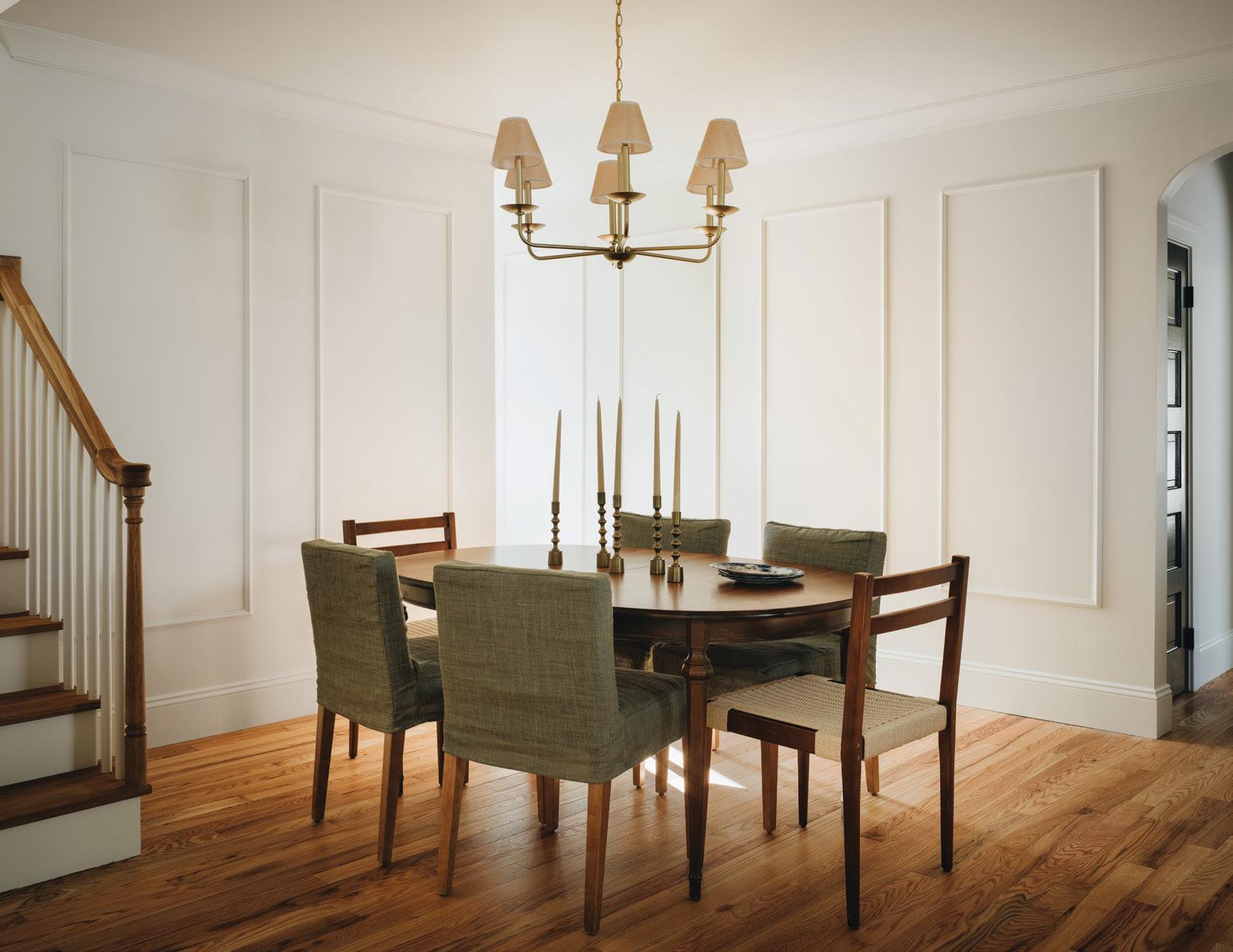 DINING ROOM PG D-69: Wall color in Swiss Coffee by Benjamin Moore, benjaminmoore.com. Chandelier from Wayfair, wayfair.com. Chairs from Stoffer Home, stofferhome.com.