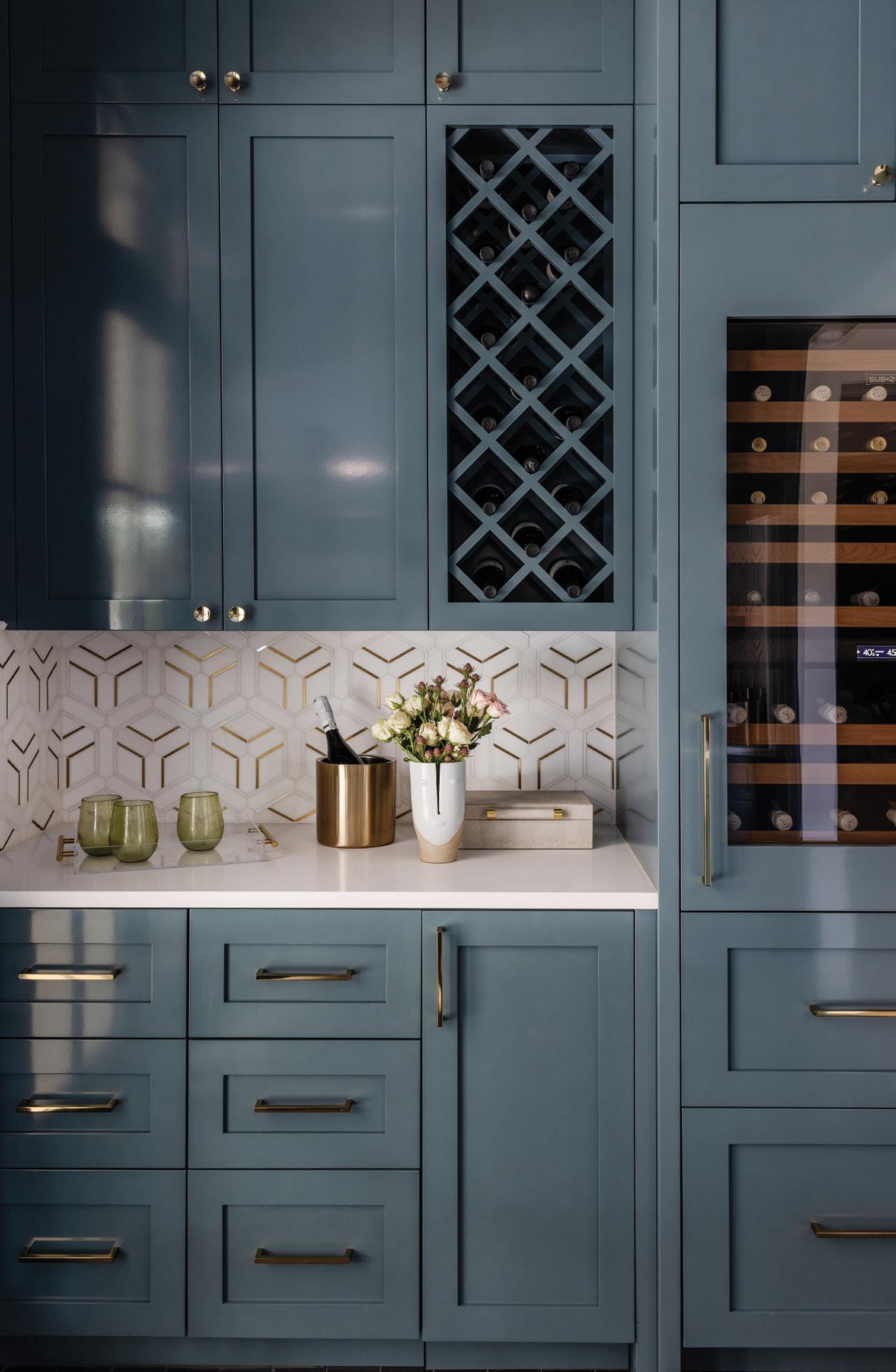 PANTRY PG 30: Countertops in White Cliff by Cambria, CambriaUSA.com. Custom cabinets in Sherwin Williams Riverway high gloss finish fabricated by Mint Hill Cabinets, minthillcabinets.com. Jeffrey Court Carve Mosaic tile backsplash in gold, jeffreycourt.com. Wine fridge by Sub-Zero, subzero-wolf.com. Cabinet hardware from Atlas Homewares, atlashomewares.com