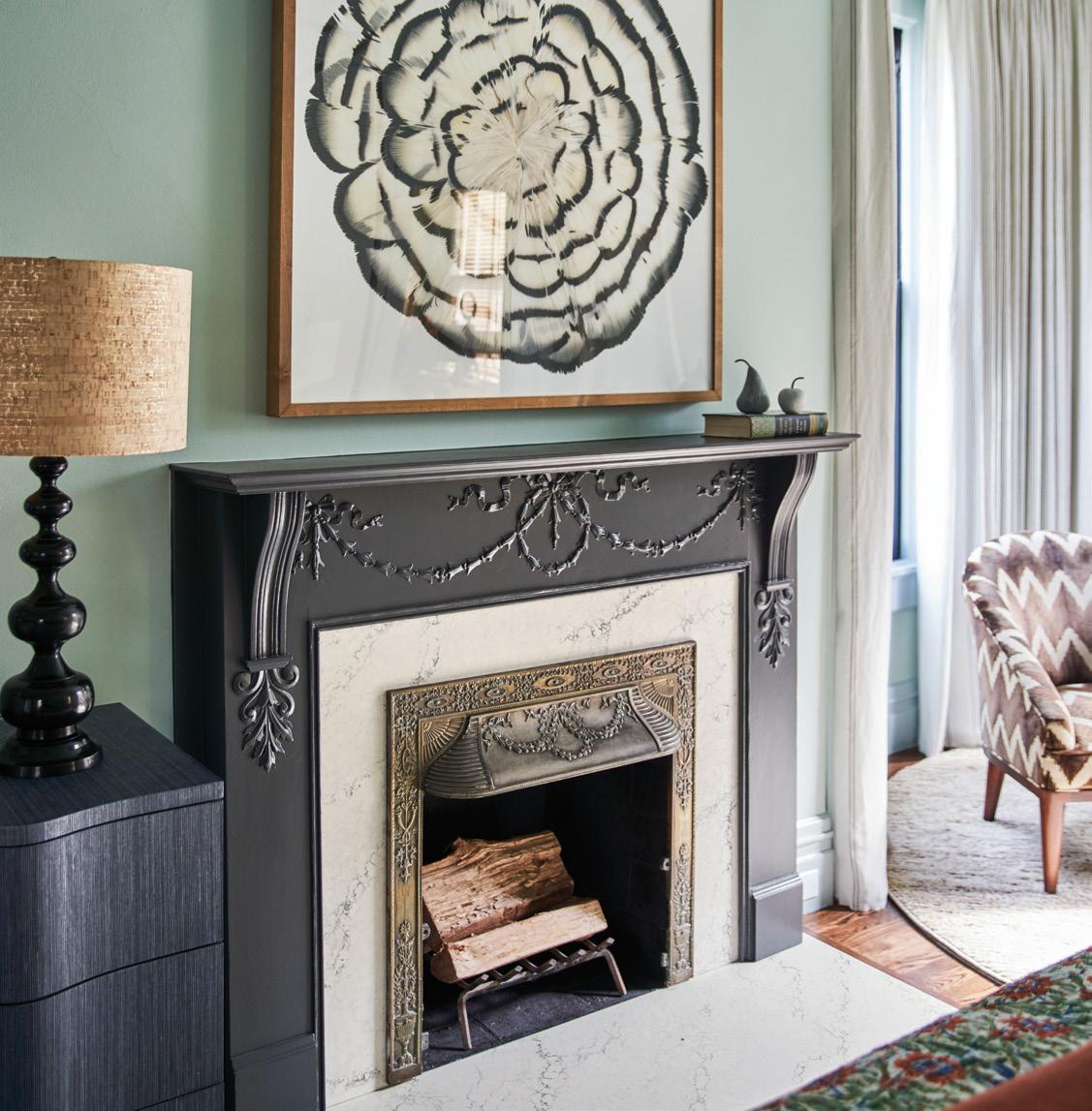 EMILIE MUNROE found herself with the happy challenge of respecting the traditional details of a beautiful Queen Anne house while modernizing it for a fun young family. One way she did this was strategically streamlining elements—for example: replacing a massive wood carved mantel in the living room with this more contemporary piece crafted of Cambria Inverness Platinum. Munroe found that Cambria’s consistent pattern and ample slabs helped her achieve the piece’s crisp right angles. She also used Cambria Sutherland on a bedroom fireplace surround and Cambria Gladstone for a bathroom countertop, creating a sense of connection that transcends matching.