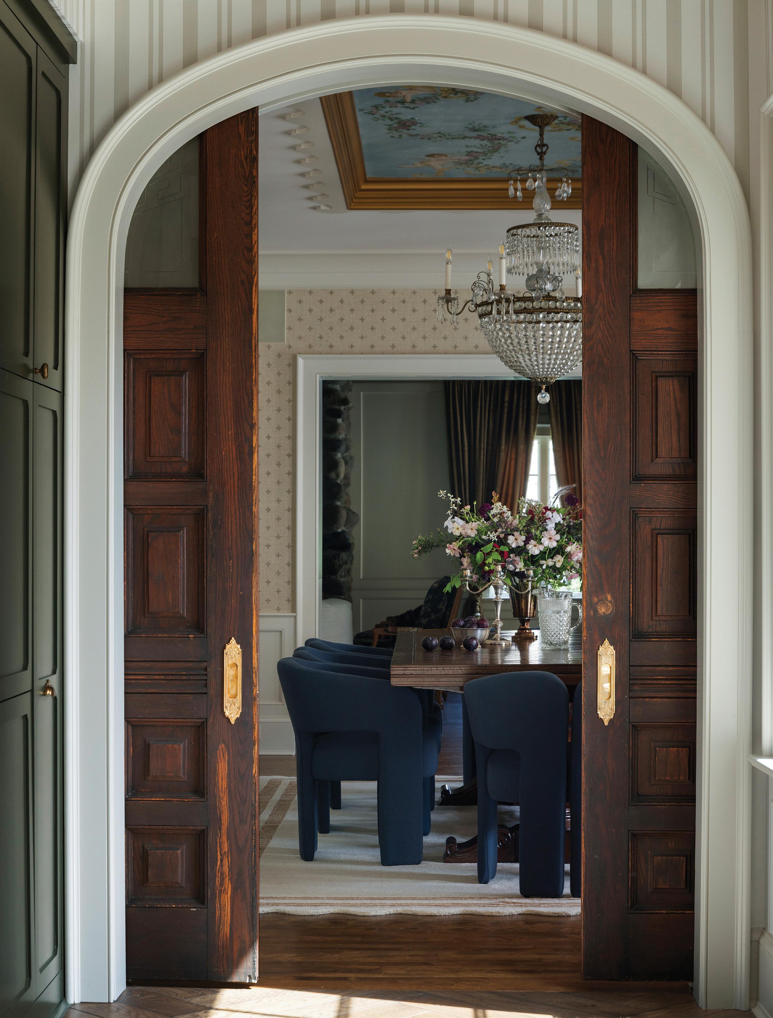 DINING ROOM PG D-71 & D-72: Wainscoting color in White Duck and cabinet color in Forest Wood by Sherwin Williams, sherwin-williams.com. Bethany wallpaper in Beige On Off White and Maggie Stripe wallpaper in beige from Thibaut, thibautdesign.com Vintage chandelier. Wall sconces from Visual Comfort, visualcomfort.com. Vintage artwork. Antique doors.