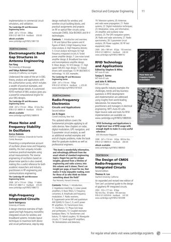An expanded and revised new edition of Tom Lee’s acclaimed guide to the design of gigahertz RF integrated circuits. 2004 253 x 177 mm 816pp 562 b/w illus. 30 tables 185 exercises 978-0-521-83539-8 Hardback £47.00 www.cambridge.org/9780521835398
