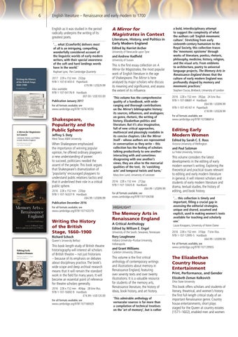 This is the first essay collection on A Mirror for Magistrates, the most popular work of English literature in the age of Shakespeare. The Mirror is here analysed by major scholars who discuss its meaning and significance, and assess the extent of its influence. ‘This volume has the comprehensive quality of a handbook, with wideranging and thorough contributions on the Mirror’s bibliographic history; its sources, influences, and analogues; on genre, rhetoric, the writing of history, Elizabethan politics and literature. But it’s also imaginative, full of new critical approaches, multivocal and pleasingly readable in its concise chapters. Like the Mirror itself – whose authors are represented in conversation as they write – this collection has the feeling of scholars talking productively to one another: interacting with and sometimes disagreeing with one another’s views, they are alive to the mercurial qualities of the text, its ‘vanishing acts’ and temporal twists and turns.’ Mary Ann Lund, University of Leicester 2016 228 x 152 mm 272pp 978-1-107-10435-8 Hardback £64.99 / US$99.99 For all formats available, see