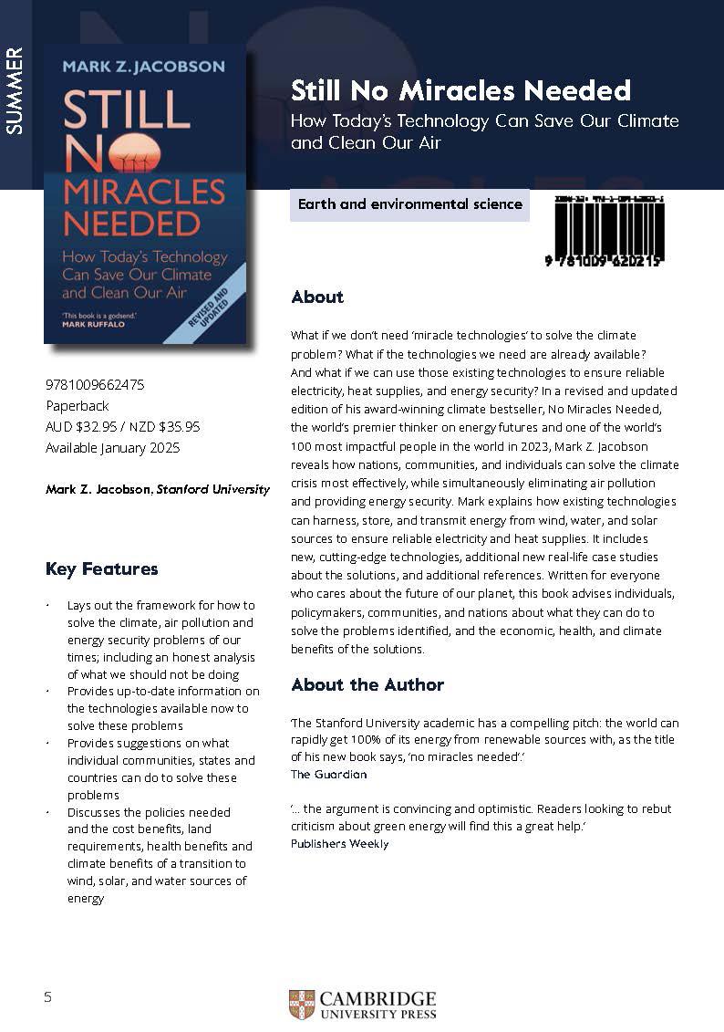 What if we don’t need ‘miracle technologies’ to solve the climate problem? What if the technologies we need are already available? And what if we can use those existing technologies to ensure reliable electricity, heat supplies, and energy security? In a revised and updated edition of his award-winning climate bestseller, No Miracles Needed, the world’s premier thinker on energy futures and one of the world’s 100 most impactful people in the world in 2023, Mark Z. Jacobson reveals how nations, communities, and individuals can solve the climate crisis most effectively, while simultaneously eliminating air pollution and providing energy security. Mark explains how existing technologies can harness, store, and transmit energy from wind, water, and solar sources to ensure reliable electricity and heat supplies. It includes new, cutting-edge technologies, additional new real-life case studies about the solutions, and additional references. Written for everyone who cares about the future of our planet, this book advises individuals, policymakers, communities, and nations about what they can do to solve the problems identified, and the economic, health, and climate benefits of the solutions.