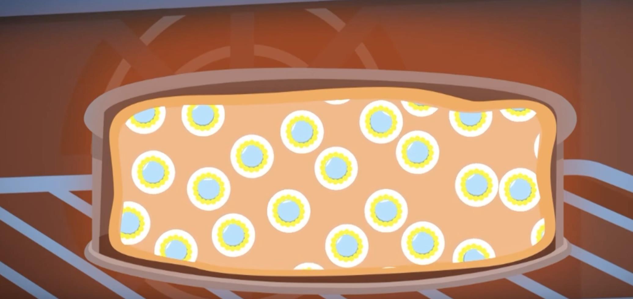 As the air heats up more, the air bubbles get bigger. While this happens, the flour begins to stretch and stretch and stretch until it can't stretch any more. This pushes the cake upwards and when this is finished, the cake is baked!