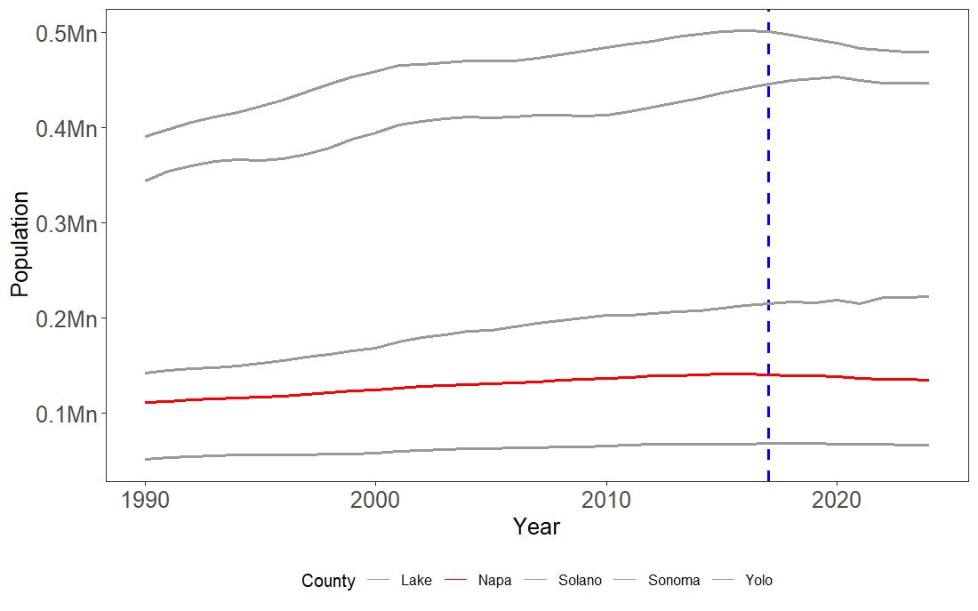 Figure E3: County-level population trends 1990 – 2023, around Camp Fire, 2018 .5 Grey lines refer to neighbouring counties.